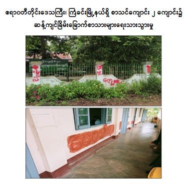 ထိုသို့ဆောင်ရွက်လျက်ရှိရာ ဇွန်လ ၁၄ ရက်နေ့ နံနက် ၇ နာရီခန့်တွင် ဧရာ၀တီတိုင်းဒေသကြီး၊ ကြံခင်းမြို့နယ်၊ ရေနံတောင်ကျေးရွာရှိ ရေနံတောင် အခြေခံပညာ အထက်တန်းကျောင်း၌ လည်းကောင်း၊ ကြံခင်းမြို့နယ်၊ ညောင်ဝိုင်းကျေးရွာရှိ ညောင်ဝိုင်း အခြေခံပညာ မူလတန်းကျောင်း၌ လည်းကောင်း၊ နံနက် ၇ နာရီ ၁၅ မိနစ်ခန့်တွင် ရန်ကုန်တိုင်းဒေသကြီး၊ သာကေတမြို့နယ်၊ ၃/မာန်ပြေရပ်ကွက်ရှိ စာသင်ကျောင်း၌ လည်းကောင်း အနာဂတ်လူငယ်များ၏ ပညာသင်ကြားခြင်းကို အဟန့်အတားဖြစ်စေသည့် ခြိမ်းခြောက်စာများ ရေးသားထားသည်ကို တွေ့ရှိရသည်။