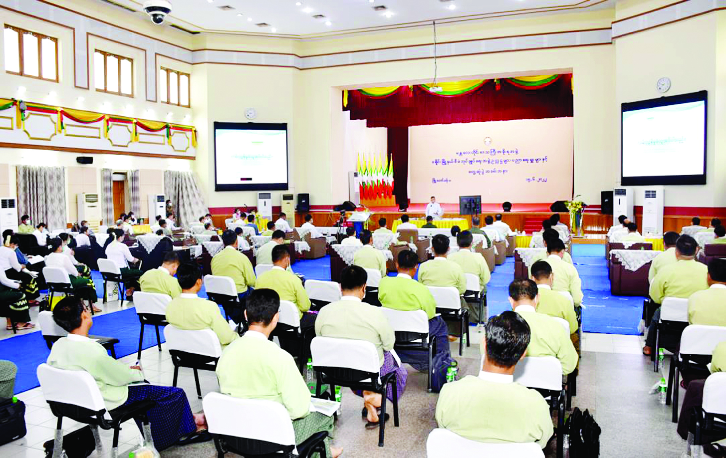 မန္တလေးတိုင်းဒေသကြီးအတွင်းရှိ ခရိုင်/မြို့နယ်များမှ စီမံအုပ်ချုပ်ရေးအဖွဲ့ဥက္ကဋ္ဌများနှင့် ပညာရေးမှူးများအားတွေ့ဆုံပွဲကို ယနေ့နံနက်ပိုင်းတွင် မန္တလေးမြို့တော် စည်ပင်သာယာရေးကော်မတီရုံး မြို့တော်ခန်းမ၌ပြုလုပ်ရာ မန္တလေးတိုင်းဒေသကြီးဝန်ကြီးချုပ် ဦးမောင်ကို၊ တိုင်းဒေသကြီးဝန်ကြီးများ၊ ဌာနဆိုင်ရာ တာဝန်ရှိသူများနှင့် ဖိတ်ကြားထားသူများ တက်ရောက်ကြသည်။