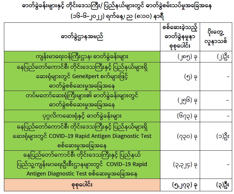 COVID-19 သံသယလူနာများ၊ ဓာတ်ခွဲအတည်ပြုလူနာနှင့် အနီးကပ်ထိတွေ့ခဲ့သူများနှင့် အသွားအလာကန့်သတ်ထားရှိသူများအား COVID-19 ရောဂါ ရှိ၊ မရှိ ဓာတ်ခွဲစမ်းသပ်စစ်ဆေးခြင်းအား ပုံမှန်ဆောင်ရွက်လျက်ရှိပြီး (၁၅-၆-၂၀၂၂) ရက်နေ့၊ ည (၈:၀၀) နာရီမှ (၁၆-၆-၂၀၂၂) ရက်နေ့၊ ည (၈:၀၀) နာရီအတွင်း ဓာတ်ခွဲနမူနာစုစုပေါင်း (၅,၂၇၃) ခုအား စစ်ဆေးပြီးစီးခဲ့ရာ COVID-19 ရောဂါ ဓာတ်ခွဲ အတည်ပြုလူနာသစ် (၃) ဦး တွေ့ရှိရပါသည်။ ထို့ကြောင့် ယနေ့အတွက် ရောဂါပိုးတွေ့ရှိမှု ရာခိုင်နှုန်းမှာ (၀.၀၆) ရာခိုင်နှုန်း ရှိပါသည်။