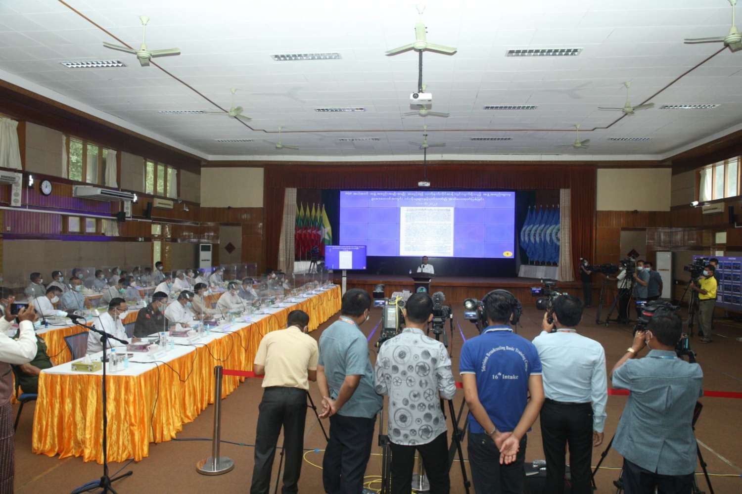 ထို့နောက် ပြည်ထောင်စုရွေးကောက်ပွဲကော်မရှင်အဖွဲ့ဝင် ဦးခင်မောင်ဦးက မဲဆန္ဒရှင်စာရင်းများ ပြည်စုံမှန်ကန်ရေး အတွက် မြေပြင်လူဦးရေစာရင်းနှင့် တိုက်ဆိုင်စစ်ဆေးခြင်းများ ဆောင်ရွက်ပြီးစီးမှုနှင့် နိုင်ငံရေးပါတီများ စစ်ဆေးခြင်းအပါအဝင် ပြည်ထောင်စုရွေးကောက်ပွဲကော်မရှင်က ဆောင်ရွက်လျက်ရှိသည့်လုပ်ငန်းစဉ်များကို PowerPoint Presentation ဖြင့် ရှင်းလင်းပြောကြားသည်။