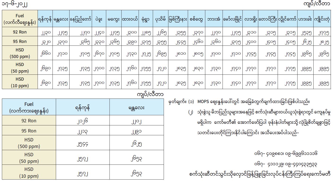 ရန်ကုန်မြို့နှင့် မန္တလေးမြို့အတွက် ရည်ညွှန်းလက်ကား ဈေးနှုန်းများနှင့် ပြည်ထောင်စုနယ်မြေ နေပြည်တော်၊ တိုင်းဒေသကြီး/ ပြည်နယ် မြို့တော်များအတွက် ရည်ညွှန်းလက်လီဈေးနှုန်းများ