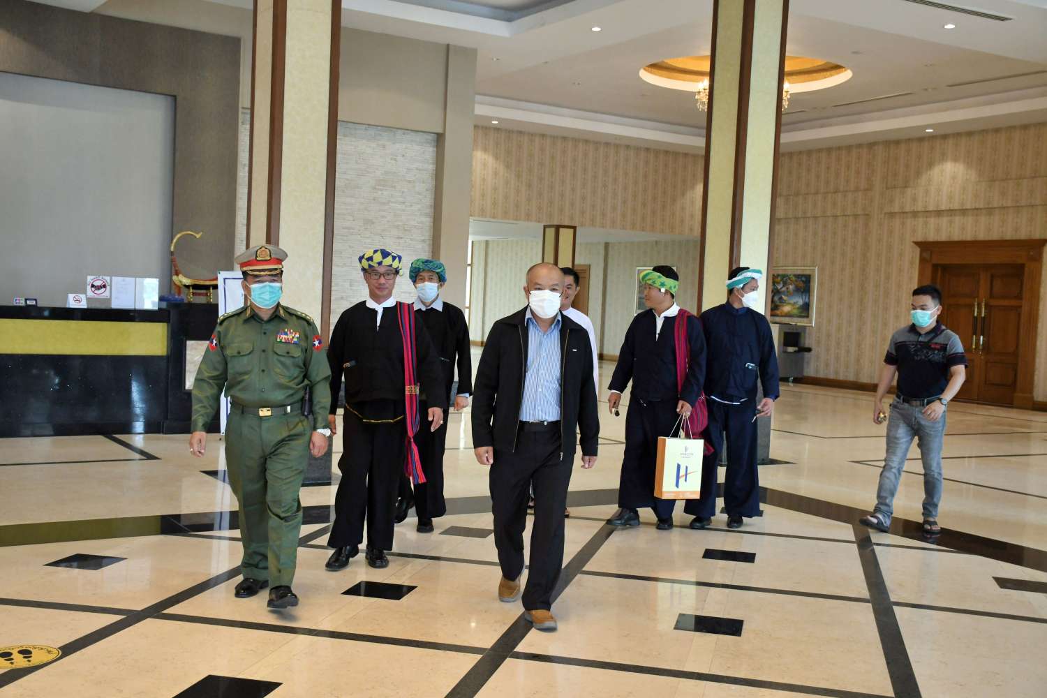 အဆိုပါ ပအိုဝ်းအမျိုးသားလွတ်မြောက်ရေးအဖွဲ့ချုပ်(PNLO)မှ ဒုတိယဥက္ကဋ္ဌ(၁) ခွန်ထွန်းတင် ဦးဆောင်သော ငြိမ်းချမ်းရေးကိုယ်စားလှယ်အဖွဲ့အား အမျိုးသားစည်းလုံးညီညွတ်ရေးနှင့် ငြိမ်းချမ်းရေးဖော်ဆောင်မှု ညှိနှိုင်းရေးကော်မတီအဖွဲ့ဝင်နှင့် တာဝန်ရှိသူများ၊ သာသနာရေးနှင့် ယဉ်ကျေးမှုဝန်ကြီးဌာန၊ အနုပညာဦးစီးဌာနမှ တိုင်းရင်းသား၊ တိုင်းရင်းသူများ၊ ဌာနဆိုင်ရာဝန်ထမ်းများ၊ ငြိမ်းချမ်းရေးကိုလိုလားသည့် ဒေသခံပြည်သူများက “ထာဝရငြိမ်းချမ်းရေးကို ရရှိရေးသည် ပြည်သူတစ်ရပ်လုံး၏ ဆန္ဒအစစ်အမှန်ဖြစ်သည်၊ ငြိမ်းချမ်းရေးရရှိရေးသည် နိုင်ငံသားအားလုံး၏ ဆန္ဒအမှန်ဖြစ်သည်၊ ပြည်ထောင်စုကြီးငြိမ်းချမ်းဖို့ တွေ့ဆုံဆွေးနွေးကြပါစို့၊ တိုင်းရင်းသားတွေစည်းလုံးမှ ငြိမ်းချမ်းတည်ငြိမ်အေးချမ်းရ” စသည့် စာသားပါဆိုင်းဘုတ်များ ကိုင်ဆောင်၍လည်းကောင်း၊ နိုင်ငံတော်အလံငယ်များကိုင်ဆောင်၍လည်းကောင်း နေပြည်တော်ရှိ Horizon Lake View Resort ၌ ပို့ဆောင်နှုတ်ဆက်ခဲ့ကြကြောင်း သိရသည်။