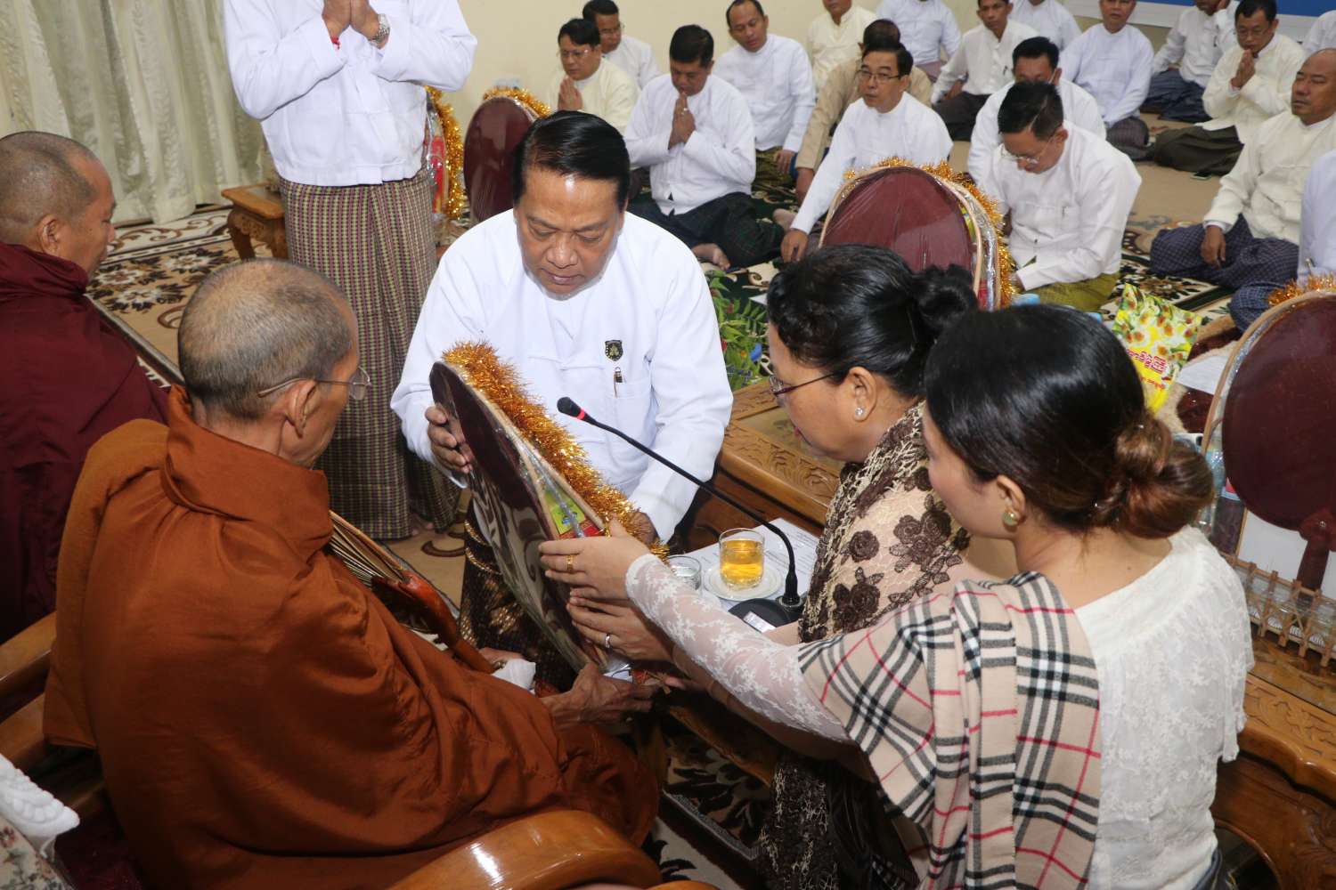 ထို့နောက် ပြည်ထောင်စုဝန်ကြီးနှင့် ဧည့်ပရိတ်သတ်များက ပါဠိတက္ကသိုလ်ကျောင်းဆရာတော်ထံမှာ အနုမောဒနာတရားနာကြားကြကာ လှူဒါန်းမှုအစုစုတို့အတွက် ရေစက်သွန်းချအမျှပေးဝေကြသည်။