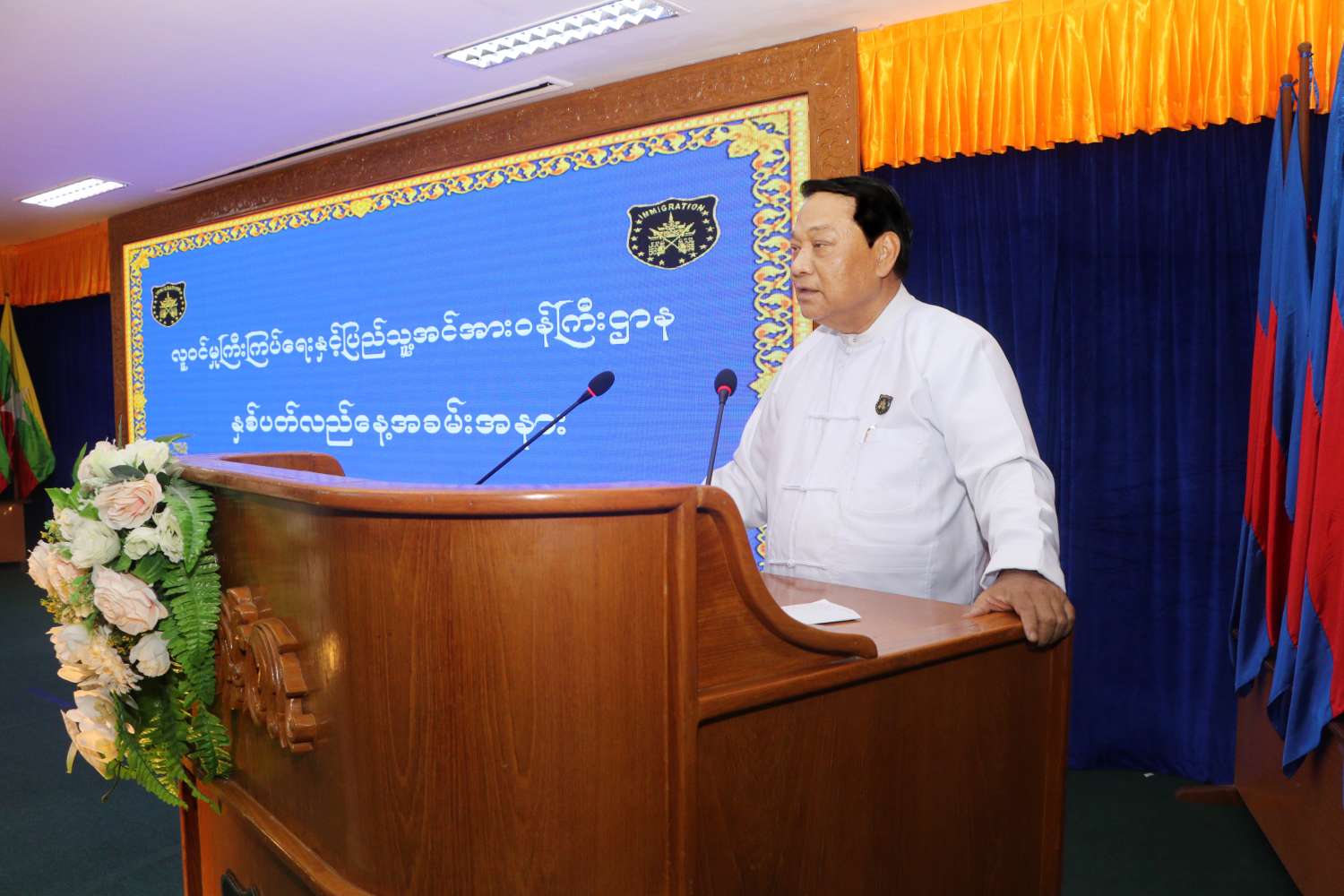 နံနက်(၉)နာရီတွင် အခမ်းအနားဒုတိယပိုင်းကို ဝန်ကြီးဌာနအစည်းအဝေးခန်းမ၌ကျင်းပရာ ပြည်ထောင်စုဝန်ကြီးက မိမိတို့ဝန်ကြီးဌာနသည် လက်ရှိဦးစီးဌာနများအနေဖြင့် ယခင်ကတည်းက အဆင့်ဆင့်ပြောင်းလဲဖွဲ့စည်းဖြစ်တည်ခဲ့ရာမှ ၁၉၉၅ ခုနှစ်၊ ဇွန် ၁၅ ရက်တွင် ဝန်ကြီးဌာန တစ်ခုသီးသန့်အဖြစ် ဖွဲ့စည်းပေါ်ပေါက်ခဲ့သည့်အတွက် ယခုဌာနဖြစ်တည်မှုမှာ ၂၇ နှစ် ရှိခဲ့ပြီဖြစ်ပါကြောင်း၊ ဝန်ကြီးဌာနအနေဖြင့် အဓိကလုပ်ငန်းတာဝန် (၃) ရပ်ချမှတ်ကာ ရည်မှန်းချက်တာဝန်များကို အကောင်အထည်ဖော်ဆောင်ရွက်လျက်ရှိပါကြောင်း၊ ယင်းကဲ့သို့ဆောင်ရွက်ရာတွင် လုပ်နည်းလုပ်ဟန်များ ပိုမိုထိရောက်မှန်ကန်မြန်ဆန်စေရေးအတွက် ခေတ်မီနည်းပညာစက် ကိရိယာများ အသုံးပြုဆောင်ရွက်လျက်ရှိပါကြောင်း၊ မိမိဌာနလုပ်ငန်းများသည် နိုင်ငံတော်လုံခြုံရေးနှင့် အမျိုးသားအကျိုးစီးပွားတို့နှင့် ဆက်စပ်လျက်ရှိပါကြောင်း၊ နိုင်ငံခြားသားများ ဝင်/ထွက် သွားလာမှုနှင့် ထိန်းသိမ်းကြီးကြပ်ဆောင်ရွက်ရေးလုပ်ငန်းများ၊ နိုင်ငံအတွင်းရှိ နိုင်ငံသားများ အားလုံး ကိုင်ဆောင်ကတ်ပြားတစ်မျိုးမျိုးရရှိရေးအတွက် ဆောင်ရွက်ထုတ်ပေးခြင်းလုပ်ငန်း များ၊ နိုင်ငံတော်ဖွံ့ဖြိုးတိုးတက်ရေးလုပ်ငန်းများအတွက် မူဝါဒများရေးဆွဲချမှတ်ရာတွင် အခြေခံအသုံးပြုမည့် လူဦးရေကိန်းဂဏန်းအချက်အလက်များရရှိရေးအတွက် သန်းခေါင် စာရင်းကောက်ယူရေးလုပ်ငန်းများကို ဥပဒေ၊ လုပ်ထုံးလုပ်နည်းများနှင့်အညီ ဆောင်ရွက်ရသည့်အတွက် ဝန်ထမ်းများအားလုံးက ဌာန၏ ဥပဒေ၊ လုပ်ထုံးလုပ်နည်းများကို ကျွမ်းကျင်ပိုင်နိုင်ရန်လိုအပ်ပါကြောင်း၊ ခေတ်နှင့်အညီဆောင်ရွက်နိုင်ရေးအတွက် နည်းပညာနှင့်ဘာသာစကားကျွမ်းကျင်ပိုင်နိုင်ရန်လိုအပ်ပြီး ဆက်ဆံရေးပြေပြစ်ကောင်းမွန်ရန်လည်းလိုအပ်ပါကြောင်း၊ နိုင်ငံနှင့်ဌာနအပေါ်သစ္စာစောင့်သိကြပြီး အစဉ်အလာကောင်းများနှင့်ဖြစ်တည်လာခဲ့သည့် ဝန်ကြီးဌာန၏နှစ်ပတ်လည်နေ့မှသည် အနာဂတ်ရှေ့လုပ်ငန်းစဉ်များအောင်မြင်ရေးအတွက် ဝန်ထမ်းအချင်းချင်းစည်းလုံးညီညွတ်မှုအားနှင့် ပေးအပ်သည့်တာဝန်များကို ကျေပွန်စွာကြိုးပမ်းဆောင်ရွက်ကြရန်လိုကြောင်းဖြင့် အကျယ်တဝင့်ရှင်လင်းပြောကြားသည်။