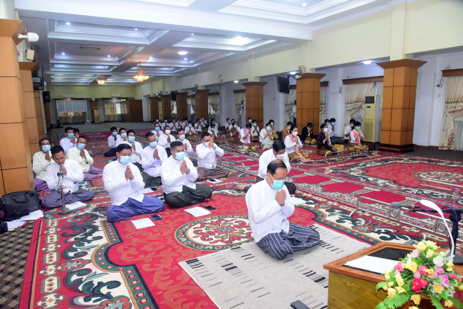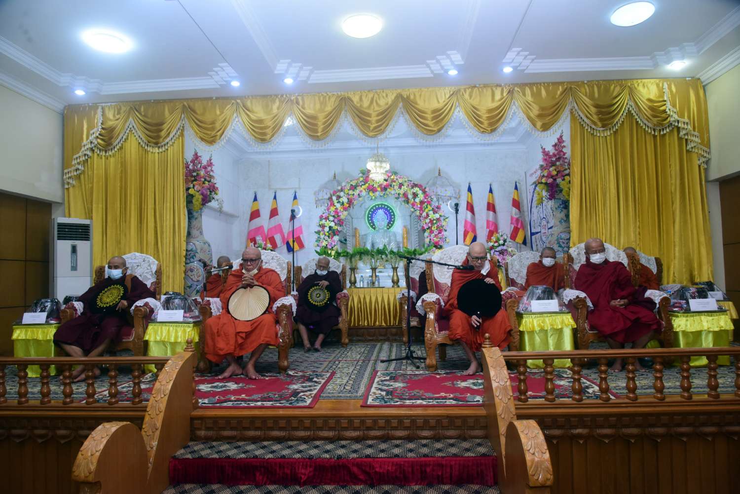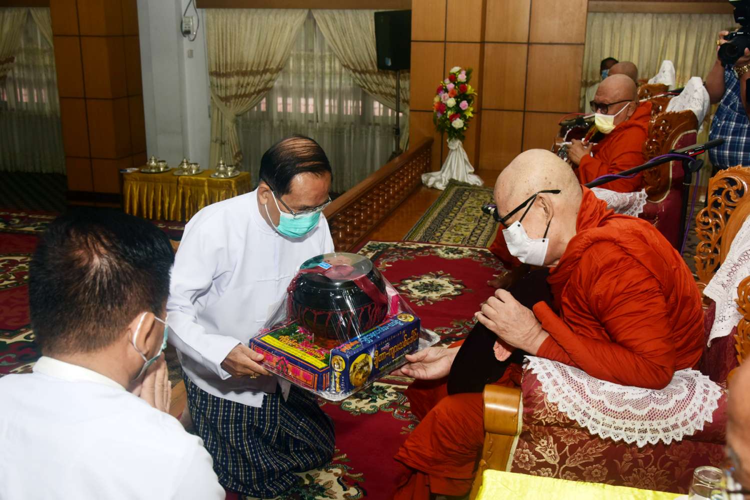 ထို့နောက် ထေရဝါဒဗုဒ္ဓသာသနာပြုသြဝါဒါစရိယအဖွဲ့ဥက္ကဋ္ဌ ဆရာတော်အဘိဓဇအဂ္ဂမဟာ သဒ္ဓမ္မဇောတိကဘဒ္ဒန္တကုမာရထံမှ ပြည်ထောင်စုဝန်ကြီးနှင့် တာဝန်ရှိသူများက ငါးပါးသီလခံယူ ဆောက်တည်ကြပြီး ထေရဝါဒဗုဒ္ဓသာသနာပြုသြဝါဒါစရိယအဖွဲ့ ဆရာတော်ကြီးများထံ လှူဖွယ်ဝတ္ထုပစ္စည်းများဆက်ကပ်လှူဒါန်းကာ ထေရဝါဒဩဝါဒါစရိယအဖွဲ့ ဒုတိယဥက္ကဋ္ဌ ဆရာတော်အဂ္ဂမဟာပဏ္ဍိတ၊ အဂ္ဂမဟာဂန္ထဝါစကပဏ္ဍိတ၊ အဂ္ဂမဟာသဒ္ဓမ္မဇောတိကဓဇဘဒ္ဒန္တသုစိတ္တထံမှ အနုမောဒနာတရားနာကြား၍ ရေစက်သွန်းချအမျှပေးဝေကြသည်။