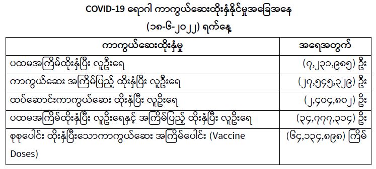 COVID-19 ရောဂါ ကာကွယ်ထိန်းချုပ်ရေးအတွက် တိုင်းဒေသကြီး/ပြည်နယ်များတွင် COVID-19 ရောဂါကာကွယ်ဆေးကို ဦးတည်အုပ်စုများသတ်မှတ်၍ ထိုးနှံပေးလျက်ရှိရာ (၁၈-၆-၂၀၂၂) ရက်နေ့အထိ လူဦးရေစုစုပေါင်း (၃၄,၇၇၇,၃၁၄) ဦးအား ထိုးနှံပေးပြီးဖြစ်၍ ပထမအကြိမ် ထိုးနှံပြီးစီးသူ (၇,၂၃၁,၉၈၅) ဦး၊ ကာကွယ်ဆေးအကြိမ်ပြည့် ထိုးနှံပြီးစီးသူ (၂၇,၅၄၅,၃၂၉) ဦးနှင့် ထပ်ဆောင်းကာကွယ်ဆေးထိုးနှံပြီးစီးသူ (၂,၄၀၄,၈၀၂) ဦးရှိပြီဖြစ်ပါသည်။ သို့ဖြစ်ပါ၍ (၁၈-၆-၂၀၂၂) ရက်နေ့ အထိ မြန်မာနိုင်ငံတွင် COVID-19 ရောဂါကာကွယ်ဆေး အကြိမ်ရေ စုစုပေါင်း (၆၄,၁၃၄,၈၉၈) ကြိမ် ထိုးနှံပြီးဖြစ်ပါသည်။