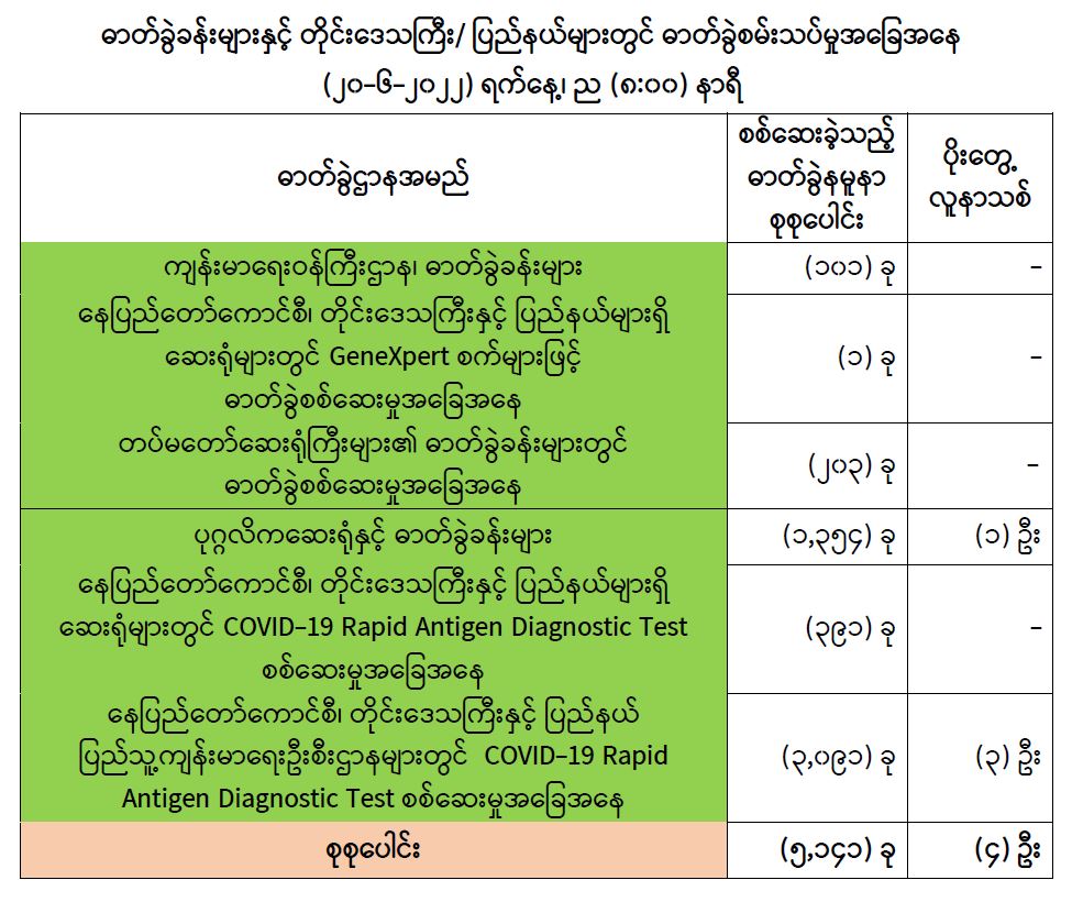 သို့ဖြစ်ပါ၍ ယနေ့အထိ ဓာတ်ခွဲနမူနာစုစုပေါင်း (၈,၃၂၂,၂၄၀) ခုအား စစ်ဆေးခဲ့ပြီး COVID-19 ဓာတ်ခွဲအတည်ပြုလူနာ စုစုပေါင်း (၆၁၃,၄၉၄) ဦး ရှိပြီ ဖြစ်ပါသည်။