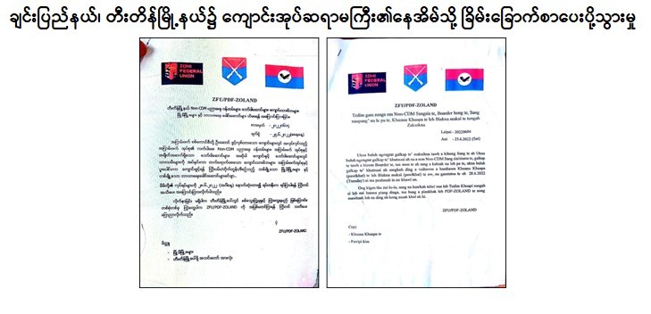 အလားတူ မွန်းလွဲ ၃ နာရီခွဲအချိန်တွင် ချင်းပြည်နယ်၊ တီးတိန်မြို့နယ်၊ စကောလမ်း ရပ်ကွက်နေ အမှတ်(၁)အခြေခံပညာ အထက်တန်းကျောင်းမှ ကျောင်းအုပ်ဆရာမ ဒေါ်မန်းတူလ်ကျိန်၏ မိခင်ဖြစ်သူ ဒေါ်ဒိပ်ဒိုးကျိန် (၇၈)နှစ် (ဘ)ဦးတွန်းဇဒါးသည် ၎င်း၏နေအိမ်၌ ရှိနေစဉ် ဆိုင်ကယ် ၁ စီးဖြင့် အကြမ်းဖက်သမား ၂ ဦး ရောက်ရှိလာပြီး နေအိမ်အတွင်းသို့ ဝင်ရောက်လာကာ ချင်းဘာသာ/ မြန်မာဘာသာ စကားတို့ဖြင့် ရေးသားထားသော ခြိမ်းခြောက်စာ ၂ စောင်အား ပေးအပ်ကာ ပြန်လည်ထွက်ခွာသွားကြောင်း သိရှိရသဖြင့် လုံခြုံရေးတပ်ဖွဲ့ဝင်များက ခြိမ်းခြောက်စာ ပို့ဆောင်ပေးသူများအား စုံစမ်းရှာဖွေလျက် ရှိကြောင်း သိရသည်။