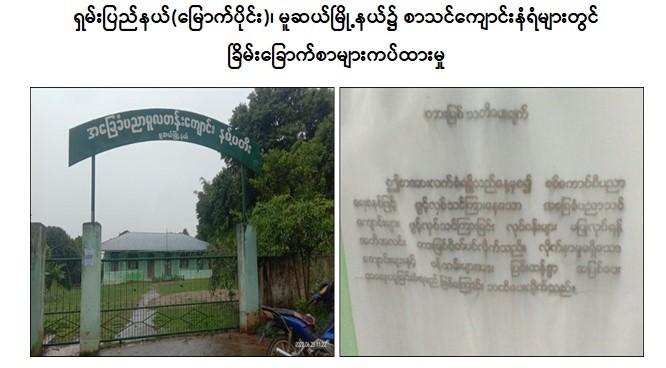 ထို့ပြင် ရှမ်းပြည်နယ်(မြောက်ပိုင်း)၊ မူဆယ်မြို့နယ်၊ ဆယ်လန့်ကျေးရွာရှိ ဆယ်လန့် အခြေခံပညာအထက်တန်းကျောင်း၊ နမ့်ပတီးကျေးရွာရှိ နမ့်ပတီး အခြေခံပညာ မူလတန်းကျောင်း၊ နောင်လောင်းကျေးရွာအုပ်စုရှိ မန်နယ် အခြေခံပညာ မူလတန်းကျောင်းနှင့် နမ့်စမ်ဂိုဒေါင် အခြေခံပညာမူလတန်းကျောင်း၊ ဖိုင်းကျောင်းကျေးရွာရှိ ဖိုင်းကျောင်း အခြေခံပညာ မူလတန်းကျောင်းတို့ရှိ ကျောင်းနံရံများတွင် အကြမ်းဖက် သမားများက ခြိမ်းခြောက်စာများ ကပ်ထားကြောင်း သတင်းအရ လုံခြုံရေးတပ်ဖွဲ့ဝင်များက သွားရောက်စစ်ဆေးခဲ့ပြီး အဆိုပါ ခြိမ်းခြောက်စာများအား ရှင်းလင်း သိမ်းဆည်းခဲ့ကြောင်း သိရသည်။