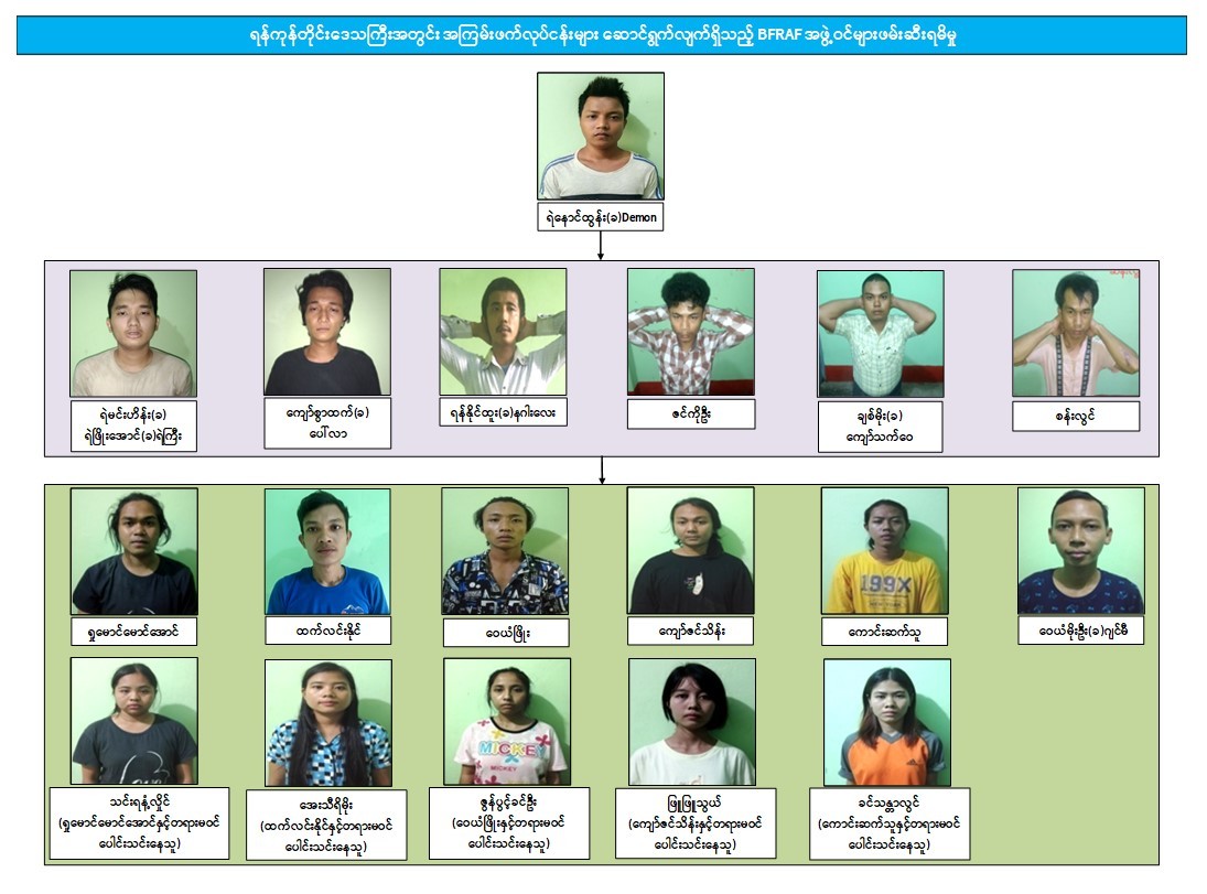 ရန်ကုန်တိုင်းဒေသကြီးအတွင်း အကြမ်းဖက်ဖောက်ခွဲဖျက်ဆီးခြင်းနှင့် အပြစ်မဲ့ပြည်သူများအား အဓိကပစ်မှတ်ထား၍ သတ်ဖြတ်ခြင်းတို့အား ဆောင်ရွက်နိုင်မှုမရှိစေရေး ဖော်ထုတ်ဖမ်းဆီးခြင်းများ ဆောင်ရွက်လျက်ရှိရာ အကြမ်းဖက်မှုအား မလိုလားသော ပြည်သူများ၏ သတင်းပေးမှုများကြောင့် ၂၀၂၂ ခုနှစ်၊ ဧပြီလ ၈ ရက်တွင် Burma Final Revolution Armed Force- BFRAF အမည်ခံ အကြမ်းဖက်အဖွဲ့ဝင် ရဲနောင်ထွန်း(ခ) Demon အား ရန်ကုန်တိုင်းဒေသကြီး၊ ဗိုလ်တထောင် မြို့နယ်တွင် လည်းကောင်း၊ ရဲမင်းဟိန်း(ခ)ရဲဖြိုးအောင်(ခ)ရဲကြီး၊ ကျော်စွာထက်(ခ)ပေါ်လာတို့အား ရွှေပြည်သာမြို့နယ်တွင် လည်းကောင်း၊ ဇွန်လ ၂၅ ရက်တွင် ရန်နိုင်ထူး(ခ)နဂါးလေးအား ထန်းတပင် မြို့နယ်၊ တူးချောင်းကျေးရွာအုပ်စု၊ ရေတလိကျေးရွာတွင် လည်းကောင်း၊ ဇွန်လ ၂၆ ရက် နံနက်ပိုင်းတွင် ဇင်ကိုဦး၊ ချစ်မိုး(ခ)ကျော်သက်ဝေ၊ စန်းလွင်တို့အား လှိုင်သာယာမြို့နယ်တွင် လည်းကောင်း ဖောက်ခွဲရေးဆက်စပ်ပစ္စည်းများနှင့်အတူ ဖမ်းဆီးရမိခဲ့သည့်သတင်းအား ဇွန်လ ၂၆ ရက်တွင် ထုတ်ပြန်ခဲ့ပြီးဖြစ်သည်။