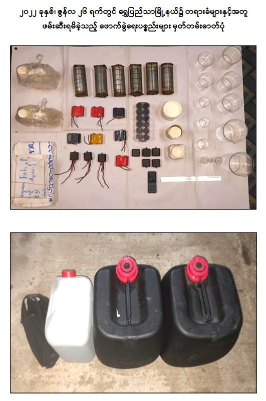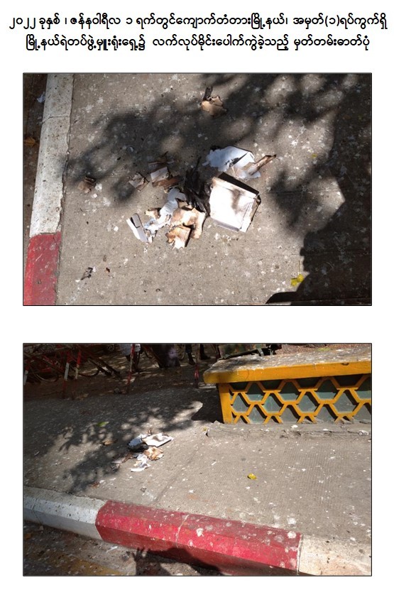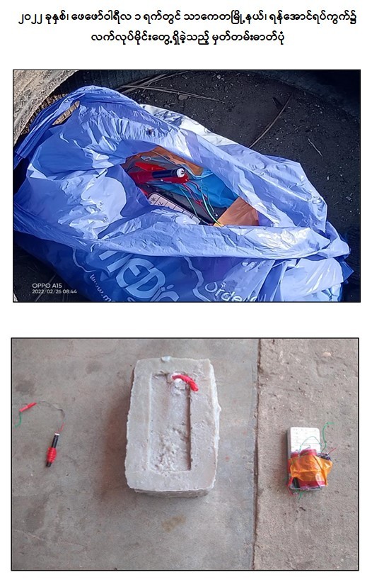 - ဖေဖော်ဝါရီလ ၁ ရက်တွင် သာကေတမြို့နယ်၊ ရန်အောင်ရပ်ကွက်၌ လက်လုပ်မိုင်း ၁ လုံးဖြင့် ပစ်ခတ်ဖောက်ခွဲခဲ့ကြောင်း။