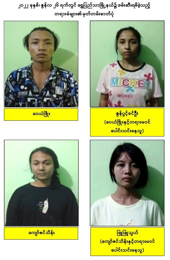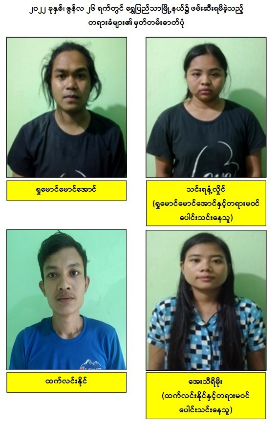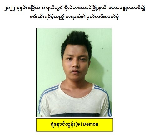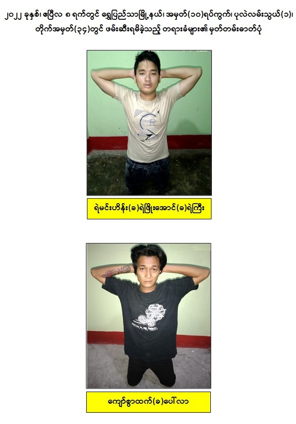 သို့ဖြစ်ပါ၍ ဖမ်းဆီးရမိတရားခံများအား ဥပဒေအရ ထိရောက်စွာ အရေးယူနိုင်ရေး ဆက်လက်ဆောင်ရွက်သွားမည်ဖြစ်ပြီး အကြမ်းဖက်မှုဆောင်ရွက်နေသူများအား ပြည်သူတစ်ရပ်လုံးက ဝိုင်းဝန်းကာကွယ်တိုက်ဖျက်ကြရန်နှင့် ပြစ်မှုကျူးလွန်ရာတွင် ပါဝင်ပတ်သက်သူများ၊ နောက်ကွယ်မှ ထောက်ပံ့ပေးလျက်ရှိသော ဆက်စပ်တရားခံများအား အမြန်ဆုံးဖမ်းဆီးရမိရေးအတွက် ၎င်းတို့ ပုန်းခိုရာနေရာများ၊ လှုပ်ရှားသွားလာ နေထိုင်မှု သတင်းများရရှိပါက သက်ဆိုင်ရာသို့ လျှို့ဝှက်စွာ သတင်းပေးတိုင်ကြားနိုင်ပါကြောင်း၊ သတင်းပေးသူနှင့် ဖမ်းဆီးပေးသူများအား ထိုက်တန်စွာ လျှို့ဝှက်၍ဆုငွေများချီးမြှင့် ပေးလျက်ရှိကြောင်းနှင့်မြို့ရွာများ အမြန်ဆုံးအေးချမ်းတည်ငြိမ်ရေးအတွက် ပြည်သူ တစ်ရပ်လုံး ပူးပေါင်းပါဝင်ကြိုးပမ်း ဆောင်ရွက်နိုင်ပါရန် မေတ္တာရပ်ခံအပ်ပါကြောင်း အသိပေး သတင်းထုတ်ပြန် အပ်ပါသည်။