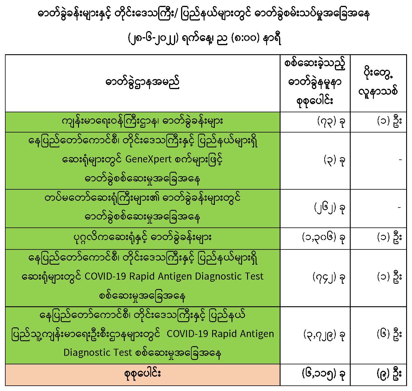 COVID-19 သံသယလူနာများ၊ ဓာတ်ခွဲအတည်ပြုလူနာနှင့် အနီးကပ်ထိတွေ့ခဲ့သူများနှင့် အသွားအလာကန့်သတ်ထားရှိသူများအား COVID-19 ရောဂါ ရှိ၊ မရှိ ဓာတ်ခွဲစမ်းသပ်စစ်ဆေးခြင်း အား ပုံမှန်ဆောင်ရွက်လျက်ရှိပြီး (၂၇-၆-၂၀၂၂) ရက်နေ့၊ ည (၈:၀၀) နာရီမှ (၂၈-၆-၂၀၂၂) ရက်နေ့၊ ည (၈:၀၀) နာရီအတွင်း ဓာတ်ခွဲနမူနာစုစုပေါင်း (၆,၁၁၅) ခုအား စစ်ဆေးပြီးစီးခဲ့ရာ COVID-19 ရောဂါ ဓာတ်ခွဲ အတည်ပြုလူနာသစ် (၉) ဦး တွေ့ရှိရပါသည်။ ထို့ကြောင့် ယနေ့အတွက် ရောဂါပိုးတွေ့ရှိမှု ရာခိုင်နှုန်းမှာ (၀.၁၅) ရာခိုင်နှုန်း ရှိပါသည်။
