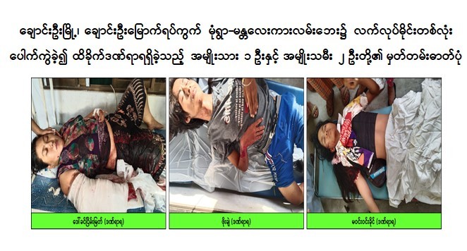 ထိုသို့အကြမ်းဖက်ဖောက်ခွဲရေး လုပ်ရပ်များကြောင့် ဇွန် ၂၇ ရက် ညနေ ၅ နာရီ ၄၅ မိနစ်အချိန်တွင် စစ်ကိုင်းတိုင်းဒေသကြီး၊ ချောင်းဦးမြို့ ပြည်သူ့ဆေးရုံသို့ ထိခိုက်ဒဏ်ရာများ ရရှိထားသည့် အမျိုးသားတစ်ဦးနှင့် အမျိုးသမီး ၂ ဦးတို့ ရောက်ရှိနေကြောင်း သတင်းအရ လုံခြုံရေးတပ်ဖွဲ့ ဝင်များက သွားရောက်စစ်ဆေးခဲ့ရာ ချောင်းဦးမြို့၊ ချောင်းဦးမြောက်ရပ်ကွက်နေ ဒေါ်ခင်ငြိမ်းမြတ်(၂၉)နှစ် (ဘ)ဦးဝင်းကိုတွင် ယာလက်ဖျံမိုင်းစထိမှန် ဒဏ်ရာ ၁ ချက်၊ ယာခြေ သလုံးမိုင်းစထိမှန်ဒဏ်ရာ ၁ ချက်၊ မုံရွာမြို့၊ အောင်ချမ်းသာရပ်ကွက် နေသူများဖြစ်ကြသည့် မောင်ဖိုးချဲ့(၁၇)နှစ် (ဘ)ဦးဇော်ခင်တွင် ဝဲပေါင်မိုင်းစထိမှန်အရိုးကျိုးဒဏ်ရာ ၂ ချက်၊ ဝဲဒူးပွန်းပဲ့ဒဏ်ရာ ၁ ချက်နှင့် မဝင်းဝင်းခိုင်(၁၇)နှစ်(ဘ)ဦးညိုဝင်းတွင် ဝဲတင်ပါးမိုင်းစထိမှန် ဒဏ်ရာ ၁ ချက်၊ ဦးခေါင်းနောက်စေ့ မိုင်းစထိမှန် ဒဏ်ရာ ၁ ချက်၊ ဝဲပေါင်ရိုးကျိုးဒဏ်ရာ ၁ ချက်တို့ ရရှိထား သည်ကိုတွေ့ရှိရသည်။