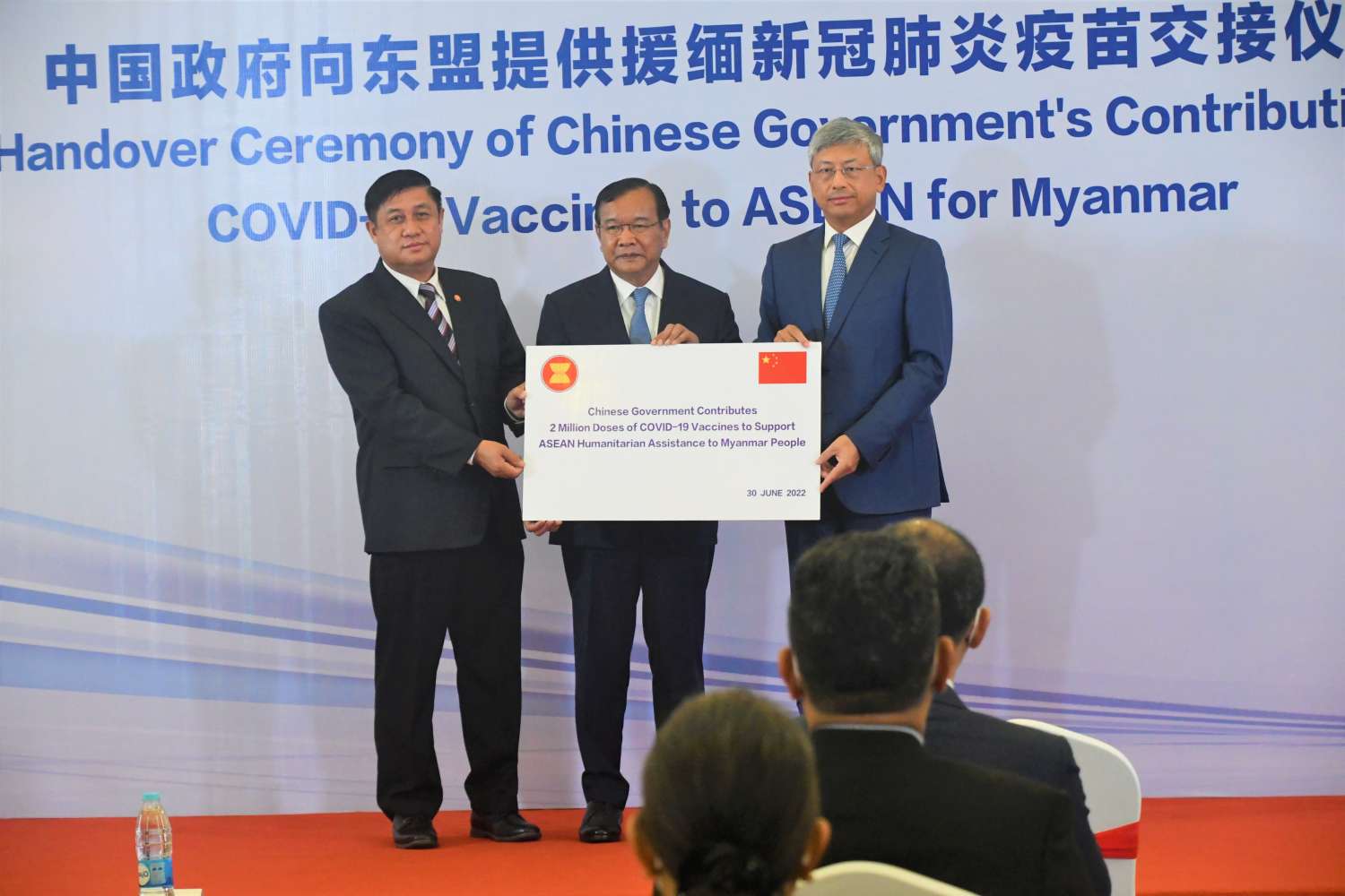 ပြီးနောက် အာဆီယံအဖွဲ့၏ ဒုတိယအထွေထွေအတွင်းရေးမှူးချုပ် H.E. Mr. Ekkaphab Phanthavong နှင့် အာဆီယံအလှည့်ကျဥက္ကဋ္ဌ၏ မြန်မာနိုင်ငံဆိုင်ရာ အထူးကိုယ်စားလှယ် ကမ္ဘောဒီးယားနိုင်ငံ ဒုတိယဝန်ကြီးချုပ်၊ နိုင်ငံခြားရေးနှင့် အပြည်ပြည်ဆိုင်ရာ ပူးပေါင်းဆောင်ရွက်ရေးဝန်ကြီး H.E. Mr. PRAK Sokhonn ထံသို့ မြန်မာနိုင်ငံဆိုင်ရာ တရုတ်သံအမတ်ကြီး မစ္စတာချန်းဟိုင်က ကိုဗစ်-၁၉ ရောဂါကာကွယ်ဆေး (၂) သန်းအား doses ပေးအပ်လှူဒါန်းသည်။