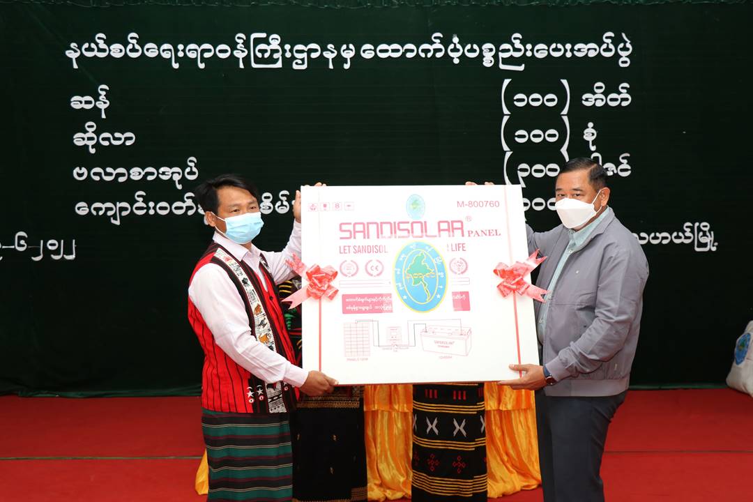 ပြည်ထောင်စုဝန်ကြီးနှင့်အဖွဲ့သည် ဇွန် ၂၉ ရက် နံနက်ပိုင်းတွင် နာဂရိုးရာ စာပေနှင့်ယဉ်ကျေးမှုခန်းမ၌ နာဂကိုယ်ပိုင်အုပ်ချုပ်ခွင့်ရဒေသ စီမံအုပ်ချုပ်ရေး အဖွဲ့ဝင်များ၊ ဒေသခံ တိုင်းရင်းသားပြည်သူများ၊ ရပ်မိ/ရပ်ဖများ၊ ဌာနဆိုင်ရာဝန်ထမ်းများနှင့် တွေ့ဆုံ၍ နာဂဒေသတည်ငြိမ်အေးချမ်းရေးနှင့် ဖွံ့ဖြိုးတိုးတက်ရေးဆိုင်ရာ ကိစ္စရပ်များကို ရှင်းလင်း ဆွေးနွေးမှာကြားခဲ့ပြီး နယ်စပ်ရေးရာဝန်ကြီးဌာနမှထောက်ပံ့လှူဒါန်းသည့် ဆန်အိတ် ၁၀၀၊ ဆိုလာ အစုံ ၁၀၀၊ ကျောင်းဝတ်စုံ ဖြူ/စိမ်း အစုံ ၃၀၀၊ ဗလာစာအုပ် ဒါဇင် ၃၀၀ တို့ကို တာဝန်ရှိသူ အသီးသီးတို့ထံပေးအပ်ခဲ့ရာ ဒေသခံတစ်ဦးမှ ကျေးဇူးတင်စကား ပြန်လည်ပြောကြားသည်။
