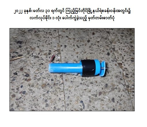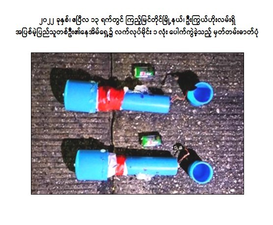 - ၂၀၂၂ ခုနှစ်ဖေဖော်ဝါရီလ ၁ ရက်တွင် လွင်ဦးမောင်နှင့် ချစ်ကိုကို(ခ)ချစ်မင်းလှိုင်တို့သည် ကြည့်မြင်တိုင်မြို့နယ်ရှိ မြို့နယ်တရားရုံးရှေ့၌ လည်းကောင်း၊ ယမုံနာ ဈေးတွင်လည်းကောင်း လက်လုပ်မိုင်း ၂ လုံး ဖောက်ခွဲခဲ့ကြောင်း။