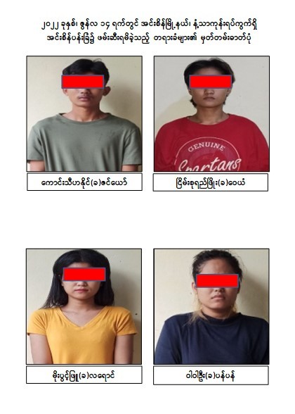 ဖြစ်စဉ်တွင် တရားခံ ကျား ၆ ဦး၊ မ ၄ ဦး၊ ပေါင်း ၁၀ ဦးတို့အား လက်လုပ် Remote မိုင်း ၂ လုံး၊ Sound Box အတွင်း ထည့်သွင်းတပ်ဆင်ထားသည့် Remote မိုင်း ၁ လုံး၊ Keypad ဖုန်း ၁ လုံး၊ ကြယ်ဖြူတစ်လုံးပါ အလံ ၁ ခုတို့နှင့်အတူ ဖမ်းဆီးရမိခဲ့သည်။