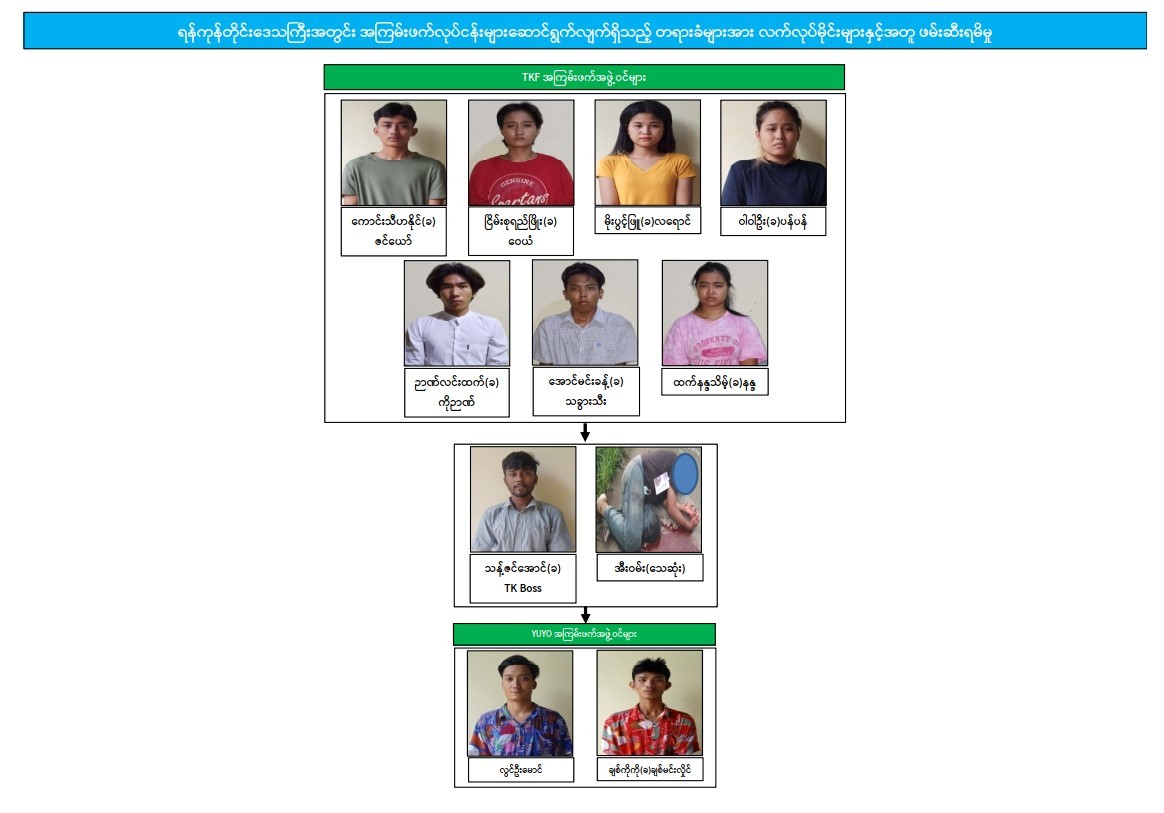 ဖမ်းဆီးရမိတရားခံ သန့်ဇင်အောင်(ခ)TK Boss၏ ထွက်ဆိုချက်အရ သင်္ဃန်းကျွန်းမြို့နယ်၊ အမှတ်(၁၃)ရပ်ကွက်၊ တိုက်အမှတ်(၃၈၁)၊ အခန်းအမှတ်(A-5)သို့ သွားရောက်ရှာဖွေခဲ့ရာ Yangon Union Young Organization-YUYO အမည်ခံ အကြမ်းဖက်အဖွဲ့မှ လွင်ဦးမောင်နှင့် ချစ်ကိုကို(ခ)ချစ်မင်းလှိုင်တို့အား ထပ်မံဖမ်းဆီးရမိခဲ့သည်။