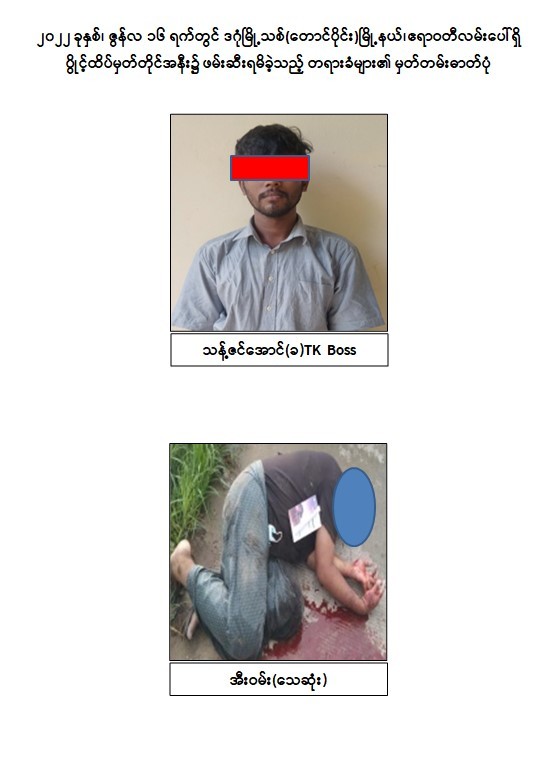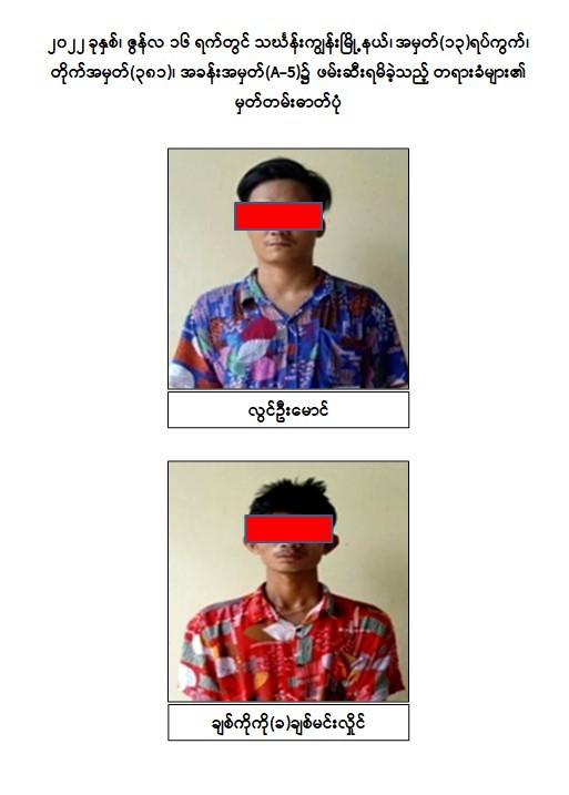 သို့ဖြစ်ပါ၍ ဖမ်းဆီးရမိတရားခံများအား ဥပဒေအရ ထိရောက်စွာ အရေးယူနိုင်ရေး ဆက်လက်ဆောင်ရွက်သွားမည်ဖြစ်ပြီး အကြမ်းဖက်မှု ဆောင်ရွက်နေသူများ အား ပြည်သူတစ်ရပ်လုံးက ဝိုင်းဝန်းကာကွယ်တိုက်ဖျက်ကြရန်နှင့် ပြစ်မှုကျူးလွန်ရာတွင် ပါဝင် ပတ်သက်သူများ၊ နောက်ကွယ်မှ ထောက်ပံ့ပေးလျက်ရှိသော ဆက်စပ်တရားခံများအား အမြန်ဆုံးဖမ်းဆီးရမိရေးအတွက် ၎င်းတို့ ပုန်းခိုရာနေရာများ၊ လှုပ်ရှားသွားလာနေထိုင်မှ သတင်းများရရှိပါက သက်ဆိုင်ရာသို့ လျှို့ဝှက်စွာ သတင်းပေးတိုင်ကြားနိုင်ပါကြောင်း၊ သတင်းပေးသူနှင့်ဖမ်းဆီးပေးသူများအား ထိုက်တန်စွာ လျှို့ဝှက်၍ ဆုငွေများပေးအပ် ချီးမြှင့်လျက် ရှိကြောင်းနှင့် မြို့ရွာများ အမြန်ဆုံးအေးချမ်းတည်ငြိမ်ရေးအတွက် ပြည်သူတစ်ရပ်လုံး ပူးပေါင်းပါဝင်ကြိုးပမ်း ဆောင်ရွက်နိုင်ပါရန် မေတ္တာရပ်ခံအပ်ပါကြောင်း အသိပေး သတင်းထုတ်ပြန်အပ်ပါသည်။