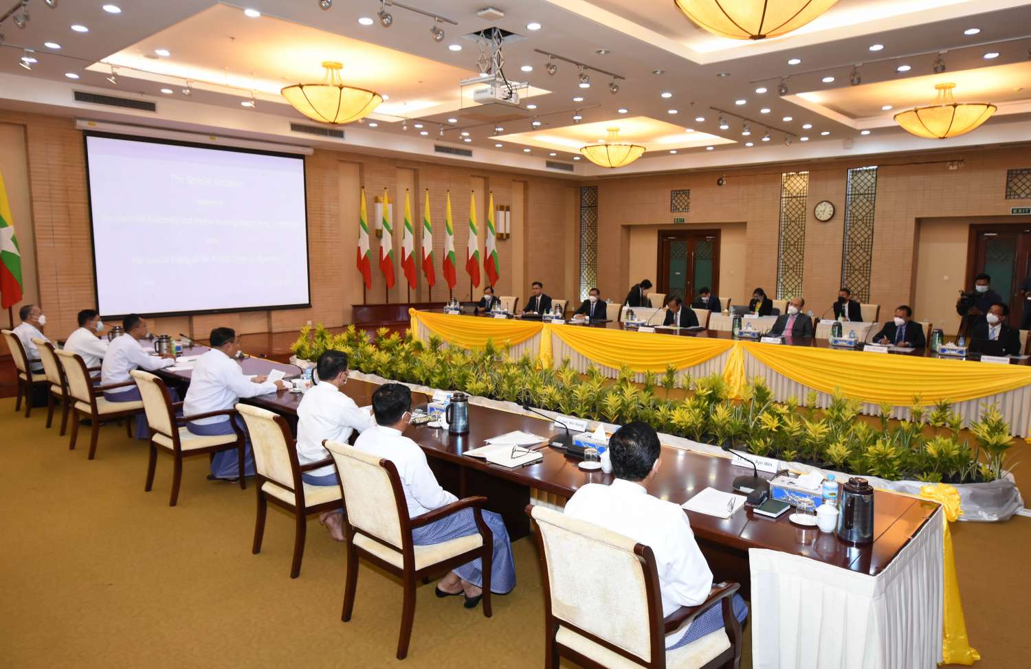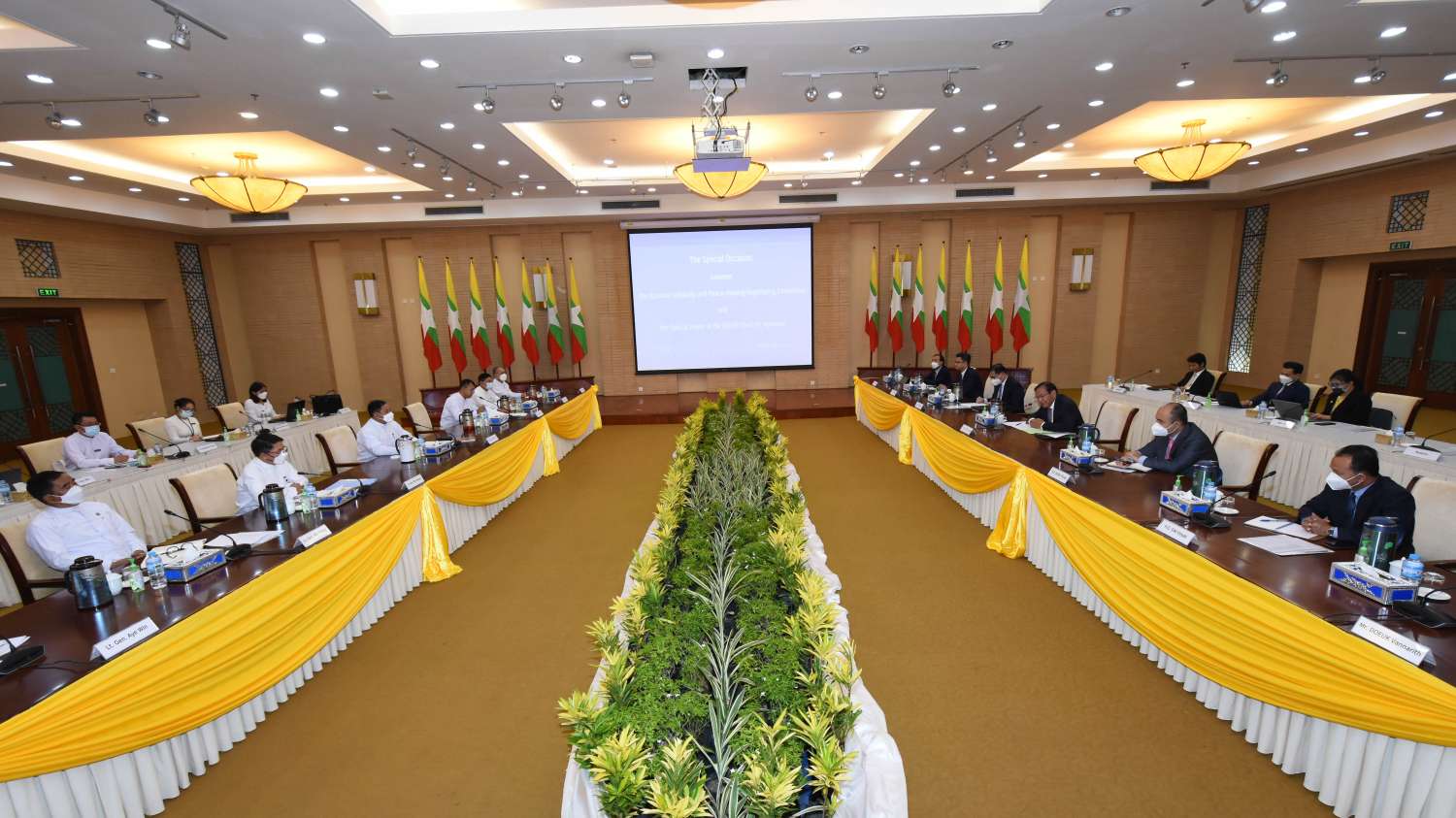 တွေ့ဆုံပွဲသို့ အမျိုးသားစည်းလုံးညီညွတ်ရေးနှင့် ငြိမ်းချမ်းရေးဖော်ဆောင်မှု ညှိနှိုင်းရေးကော်မတီအတွင်းရေးမှူး ဒုတိယဗိုလ်ချုပ်ကြီး မင်းနောင်၊ အဖွဲ့ဝင်များဖြစ်ကြသည့် ဒုတိယဗိုလ်ချုပ်ကြီး မင်းနိုင်၊ ဒုတိယဗိုလ်ချုပ်ကြီး ဝင်းဗိုလ်ရှိန်၊ ဒုတိယဗိုလ်ချုပ်ကြီး အေးဝင်း၊ ဦးလှမောင်ရွှေနှင့် အာဆီယံအလှည့်ကျဥက္ကဋ္ဌ၏ မြန်မာနိုင်ငံဆိုင်ရာ အထူးကိုယ်စားလှယ်၊ ကမ္ဘောဒီးယားနိုင်ငံ ဒုတိယဝန်ကြီးချုပ် ဦးဆောင်သည့် ကိုယ်စားလှယ် အဖွဲ့ဝင်များ တက်ရောက်ကြသည်။