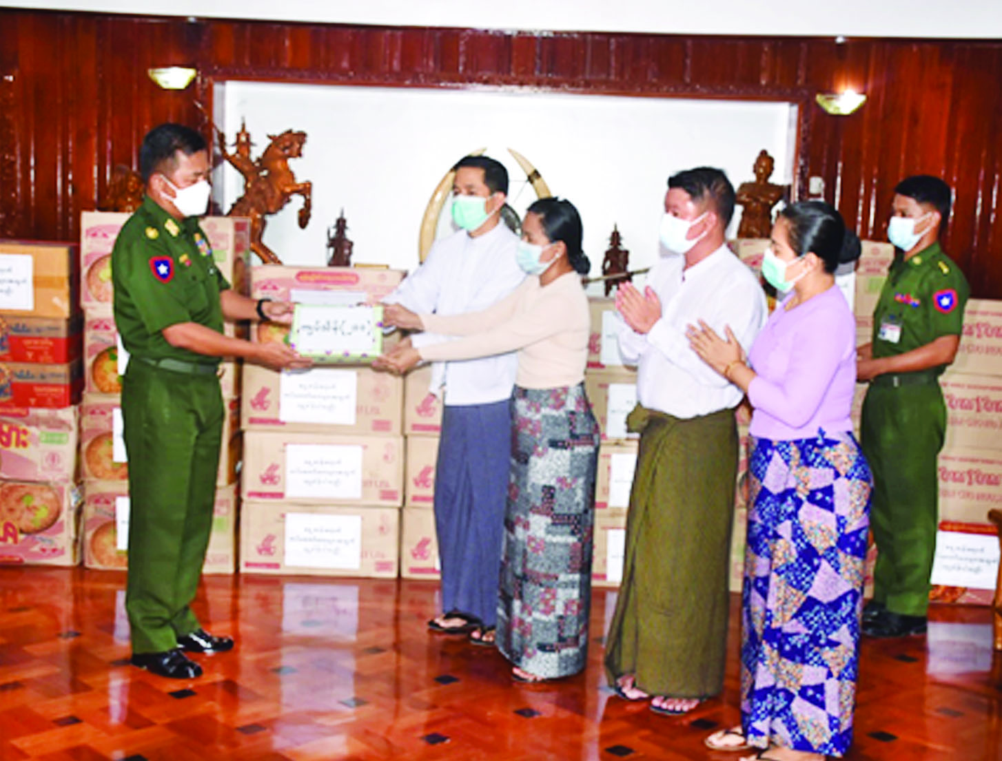 တပ်မတော်သားများအတွက် ပေးအပ်ချီးမြှင့်သော စားသောက်ဖွယ်ရာ ၁၁ မျိုးကို မွန်ပြည်နယ် (YMBA) ဒုတိယဥက္ကဋ္ဌ ဦးအောင်မိုးက ပေးအပ်ချီးမြှင့်ရာ တိုင်းမှူးဗိုလ်ချုပ် ကိုကိုမောင်က လက်ခံရယူပြီး ကျေးဇူးတင်စကား ပြန်လည်ပြောကြားသည်။