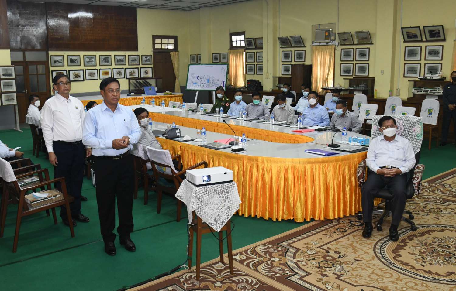 ဦးစွာ အစည်းအဝေးခန်းမတွင် ပို့ဆောင်ရေးနှင့် ဆက်သွယ်ရေးဝန်ကြီးဌာန ပြည်ထောင်စုဝန်ကြီး ဗိုလ်ချုပ်ကြီး တင်အောင်စန်းက ပြည်တွင်းရေကြောင်း ပို့ဆောင်ရေးဌာန သမိုင်းအကျဉ်း၊ ဌာန၏ရည်မှန်းချက်များ၊ ဌာနများအလိုက် ဖွဲ့စည်းထားရှိမှုနှင့် ဝန်ထမ်းများခန့်အပ်ထားရှိမှု အခြေအနေများ၊ ဌာနခွဲများအလိုက် ရေယာဉ်များထားရှိမှုနှင့်နှင့် ရေယာဉ်များ ထိန်းသိမ်းထားရှိမှု အခြေအနေများ၊ သင်္ဘောကျင်းများ၏ လုပ်ငန်းဆောင်ရွက်နေမှုနှင့် ရေယာဉ်များလွန်းတင်၍ ပြုပြင်ထိန်းသိမ်းမှုလုပ်ငန်းများ ဆောင်ရွက်နေမှုအခြေအနေများ၊ ဘဏ္ဍာရေးနှစ်အလိုက် ရေယာဉ်များ တည်ဆောက်နိုင်မှု၊ ပြင်ပပုဂ္ဂလိကရေယာဉ်များ ပြုပြင်မှုမှ ဝင်ငွေရရှိမှု၊ နိုင်ငံတစ်ဝှမ်းရှိ ဌာနခွဲများအလိုက် ရေယာဉ်များ ပြေးဆွဲနိုင်မှု အခြေအနေများကိုလည်းကောင်း။