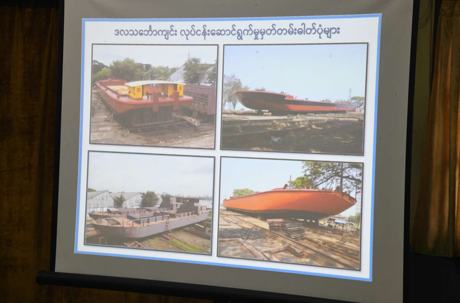 ပြည်တွင်းရေကြောင်းပို့ဆောင်ရေး ဦးဆောင်ညွှန်ကြားရေးမှူး ဦးဌေးအောင်က မြန်မာနိုင်ငံရှိ သင်္ဘောကျင်းများအနက် ရှေးအကျဆုံးဖြစ်သည့် ဒလသင်္ဘောကျင်း၏ သမိုင်းမှတ်တမ်းများ၊ ခေတ်အဆက်ဆက် သင်္ဘောများ ပြုပြင်ထိန်းသိမ်း ဆောင်ရွက်ခဲ့မှု၊ ဒလသင်္ဘောကျင်းမှ တာဝန်ယူဆောင်ရွက်ထားသည့် လုပ်ငန်းတာဝန်များ၊ ဌာနများဖွဲ့စည်းထားရှိမှုနှင့် ဝန်ထမ်းများခန့်အပ်ထားရှိမှု၊ လွန်းကျင်းများအလိုက် သင်္ဘောများ ပြုပြင်ထိန်းသိမ်းဆောင်ရွက်နေမှု၊ ရေယာဉ်များ အသစ်တည်ဆောက်ခဲ့မှုနှင့် လာမည့်ဘဏ္ဍာနှစ်များတွင် ရေယာဉ်ပြုပြင်ခြင်းလုပ်ငန်းများ ဆောင်ရွက်သွားမည့် အခြေအနေများ၊ ရည်မှန်းချက်တာဝန်များအပေါ် အကောင်အထည်ဖော်ဆောင်ရွက်သွားမည့် အခြေအနေများကိုလည်းကောင်း အသီးသီး ရှင်းလင်းတင်ပြကြသည်။