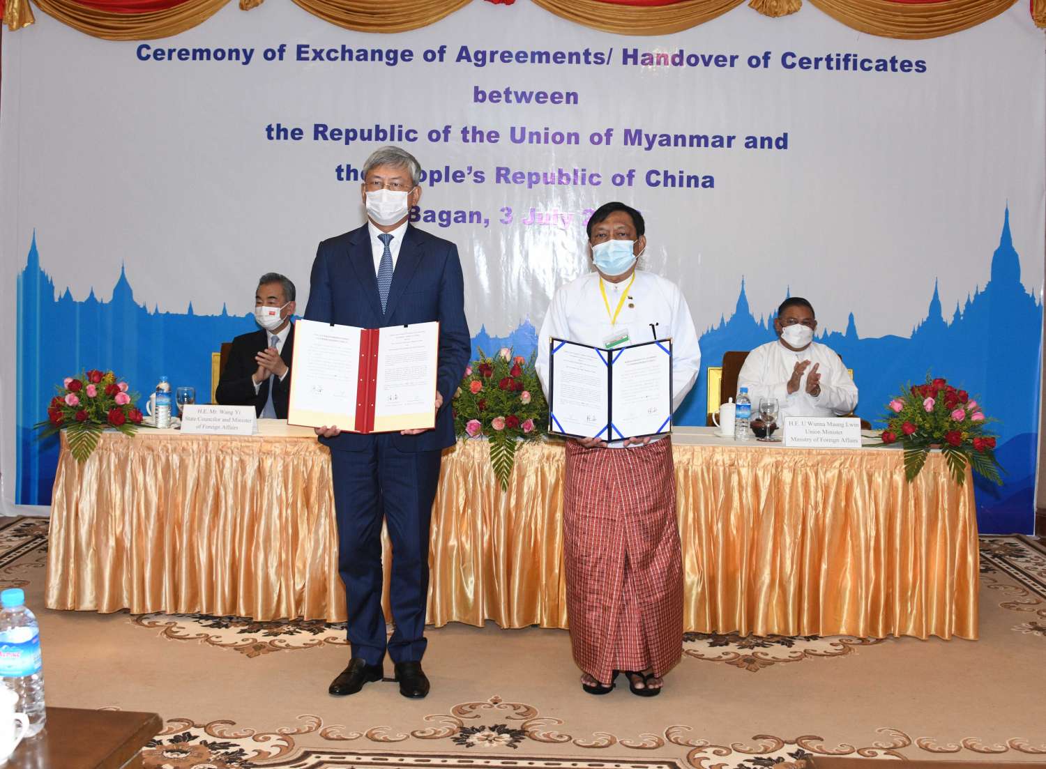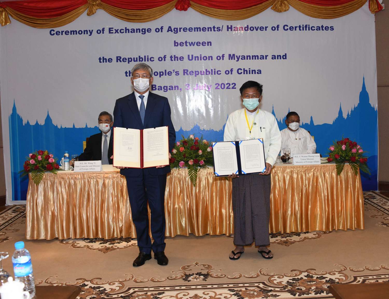 နှစ်နိုင်ငံ ဆွေးနွေးပွဲအပြီးတွင် နိုင်ငံခြားရေးဝန်ကြီးများ၏ ရှေ့မှောက်၌ လန်ချန်း-မဲခေါင် ပူးပေါင်းဆောင်ရွက်မှု အထူးရန်ပုံငွေ ၂၀၂၂ ခုနှစ် စီမံကိန်းရန်ပုံငွေ လွှဲပြောင်းလက်ခံလွှာ၊ စီးပွားရေးနှင့် နည်းပညာ ပူးပေါင်းဆောင်ရွက်ရေး သဘောတူညီချက်၊ တရုတ်နိုင်ငံ၏ အထောက်အပံ့ဖြင့် အမှတ်(၂) စက်မှုသင်တန်းကျောင်း (မန္တလေး) အဆင့်မြှင့်တင်ရေး စီမံကိန်း သဘောတူညီချက်၊ တိရစ္ဆာန်ရောဂါရှာဖွေရေး ဓါတ်ခွဲခန်း အဆင့်မြှင့်တင်ရေး စီမံကိန်းသဘောတူညီချက်၊ တရုတ်နိုင်ငံမှ မြန်မာနိုင်ငံ မြောက်ပိုင်းဒေသသို့ လှူဒါန်းသည့် ယွမ် (၁၀ ဒသမ ၅) သန်းတန်ဖိုးရှိ အရေးပေါ် ကူးစက်ရောဂါကာကွယ်ရေး အထောက်အပံ့များနှင့် မြန်မာနိုင်ငံသို့ လှူဒါန်းသည့် ယွမ် (၃၂) သန်းတန်ဖိုးရှိ အရေးပေါ် ကူးစက်ရောဂါကာကွယ်ရေး အထောက်အပံ့များဆိုင်ရာ လွှဲပြောင်းပေးအပ်/ လက်ခံလွှာ၊ တရုတ်နိုင်ငံမှ မြန်မာနိုင်ငံသို့ အလွယ်တကူ တပ်ဆင်နိုင်သည့် အိမ်အလုံးရေ (၁,၀၀၀) လွှဲပြောင်းပေးအပ်/လက်ခံလွှာတို့ကို မြန်မာဘက်မှ သက်ဆိုင်ရာဝန်ကြီးဌာနများမှ ကိုယ်စားလှယ်များနှင့် တရုတ်ဘက်မှ မြန်မာနိုင်ငံဆိုင်ရာ တရုတ်သံအမတ်ကြီးတို့က လွှဲပြောင်းလက်ခံ လဲလှယ်ခဲ့ကြသည်။