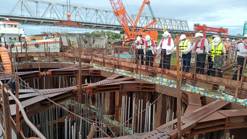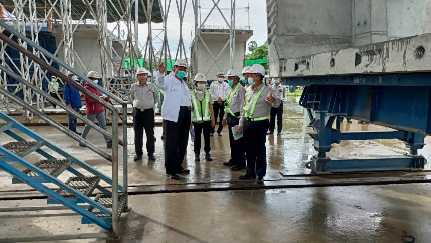 ထို့နောက် ပြည်ထောင်စုဝန်ကြီးနှင့်အဖွဲ့သည် သာကေတဘက်ခြမ်း တံတားတည်ဆောက်ရေး လုပ်ငန်းခွင်သို့ သွားရောက်၍ P C Box Girder ထုတ်လုပ်နေမှု၊ လုပ်ငန်းခွင်အတွင်း သယ်ယူပို့ဆောင်ပေးနေမှုနှင့် Span by Span Method ဂျပန်နည်းပညာဖြင့် တပ်ဆင်မည့် အခြေအနေတို့ကို လည်းကောင်း၊ Fly Over Bridge တည်ဆောက်ပြီးစီးမှုကို လည်းကောင်း သံလျင်ဘက်ခြမ်းသို့ သွားရောက်၍ ချဉ်းကပ်တံတား ဆောင်ရွက်နေမှုကို လည်းကောင်း၊ ရေလယ်တိုင်အမှတ်(၆) လုပ်ငန်းများ ဆောင်ရွက်နေမှုကို လည်းကောင်း၊ လွန်းထိုးခြင်း (Launching)နည်းပညာကို အသုံးပြု၍ P C Box Girder များ တပ်ဆင်ရန် ပြင်ဆင်မှုကို လည်းကောင်း ကြည့်ရှုစစ်ဆေးပြီး လုပ်ငန်းခွင် ဘေးအန္တရာယ်ကင်းရှင်းရေးအား အမြဲဂရုပြုဆောင်ရွက်ရန် တာဝန်ရှိသူများအား မှာကြားသည်။