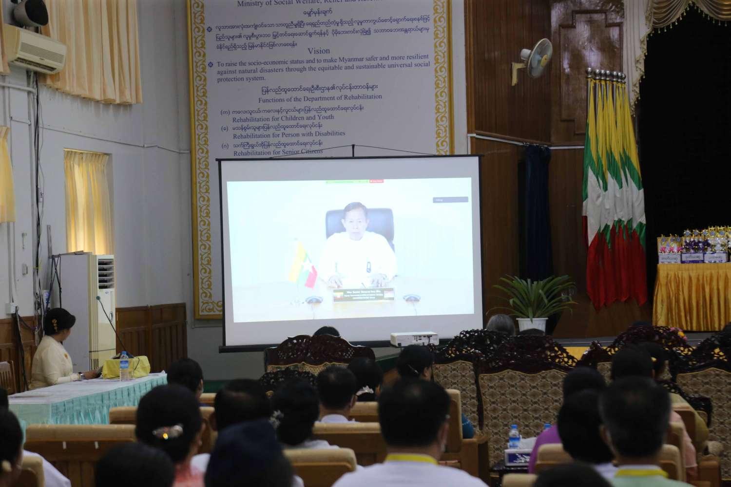 ဆက်လက်၍ မြန်မာနိုင်ငံလုံးဆိုင်ရာ အမျိုးသမီးကော်မတီဥက္ကဋ္ဌ၊ လူမှုဝန်ထမ်း၊ ကယ်ဆယ်ရေးနှင့် ပြန်လည်နေရာချထားရေးဝန်ကြီးဌာန ပြည်ထောင်စုဝန်ကြီး ဒေါက်တာ သက်သက်ခိုင်က အမျိုးသမီးများ ဖွံ့ဖြိုးတိုးတက်ရေး၊ အမျိုးသမီးအခွင့်အရေး မြင့်တင်ဖော်ဆောင်မှုနှင့် အမျိုးအမီများအပေါ် နည်းမျိုးစုံဖြင့် အကြမ်းဖက်ခံရမှု တားဆီးကာကွယ်ရေးဆိုင်ရာ ဆောင်ရွက်မှုများကို ရှင်းလင်းတင်ပြသည်။