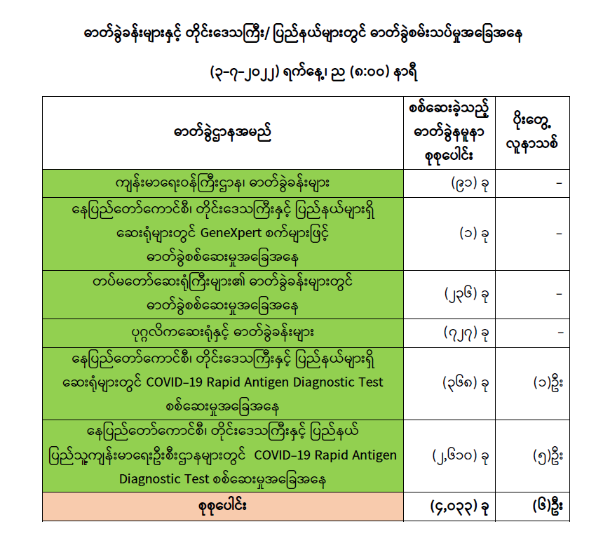 သို့ဖြစ်ပါ၍ ယနေ့အထိ ဓာတ်ခွဲနမူနာစုစုပေါင်း (၈,၃၈၆,၆၈၉) ခုအားစစ်ဆေးခဲ့ပြီး COVID-19 ဓာတ်ခွဲအတည်ပြုလူနာ စုစုပေါင်း (၆၁၃,၆၄၈) ဦး ရှိပြီ ဖြစ်ပါသည်။
