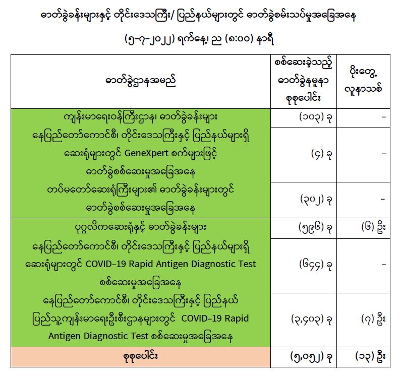 သို့ဖြစ်ပါ၍ ယနေ့အထိ ဓာတ်ခွဲနမူနာစုစုပေါင်း (၈,၃၉၆,၁၈၈) ခုအား စစ်ဆေးခဲ့ပြီး COVID-19 ဓာတ်ခွဲအတည်ပြုလူနာ စုစုပေါင်း (၆၁၃,၆၇၂) ဦး ရှိပြီဖြစ်ပါသည်။