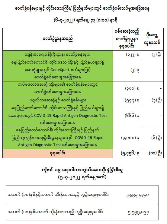 COVID-19 ရောဂါ ကာကွယ်ထိန်းချုပ်ရေးအတွက် တိုင်းဒေသကြီး/ပြည်နယ်များတွင် COVID-19 ရောဂါကာကွယ်ဆေးကို ဦးတည်အုပ်စုများသတ်မှတ်၍ ထိုးနှံပေးလျက်ရှိရာ (၅-၇-၂၀၂၂) ရက်နေ့အထိ အသက် (၁၈) နှစ်နှင့်အထက် လူဦးရေစုစုပေါင်း (၂၉,၉၃၇,၃၄၀) ဦး နှင့် အသက် (၁၈) နှစ် အောက် လူဦးရေစုစုပေါင်း (၅,၅၉၅,၈၉၄) ဦး တို့အား ထိုးနှံထားရှိပြီး ဖြစ်ပါသည်။