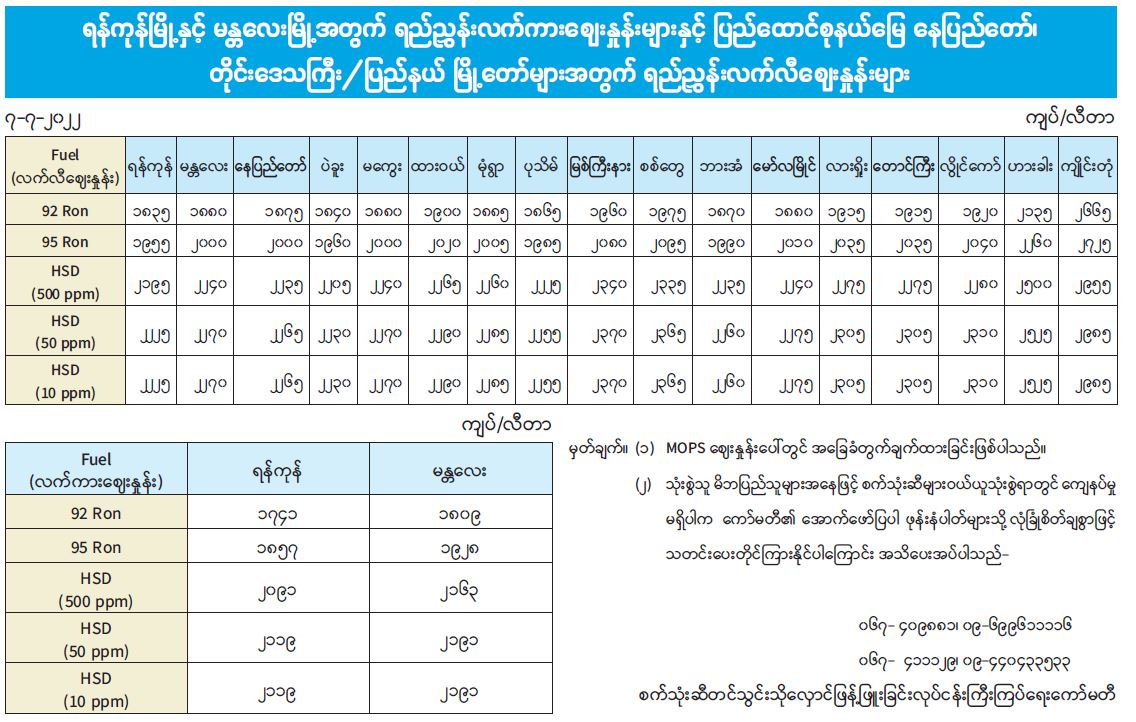 ရန်ကုန်မြို့နှင့်မန္တလေးမြို့အတွက် ရည်ညွှန်းလက်ကားဈေးနှုန်းများနှင့် ပြည်ထောင်စုနယ်မြေ၊နေပြည်တော်၊ တိုင်းဒေသကြီး/ပြည်နယ်မြို့တော်များအတွက် ရည်ညွှန်းလက်လီဈေးနှုန်းများ 07/07/2022