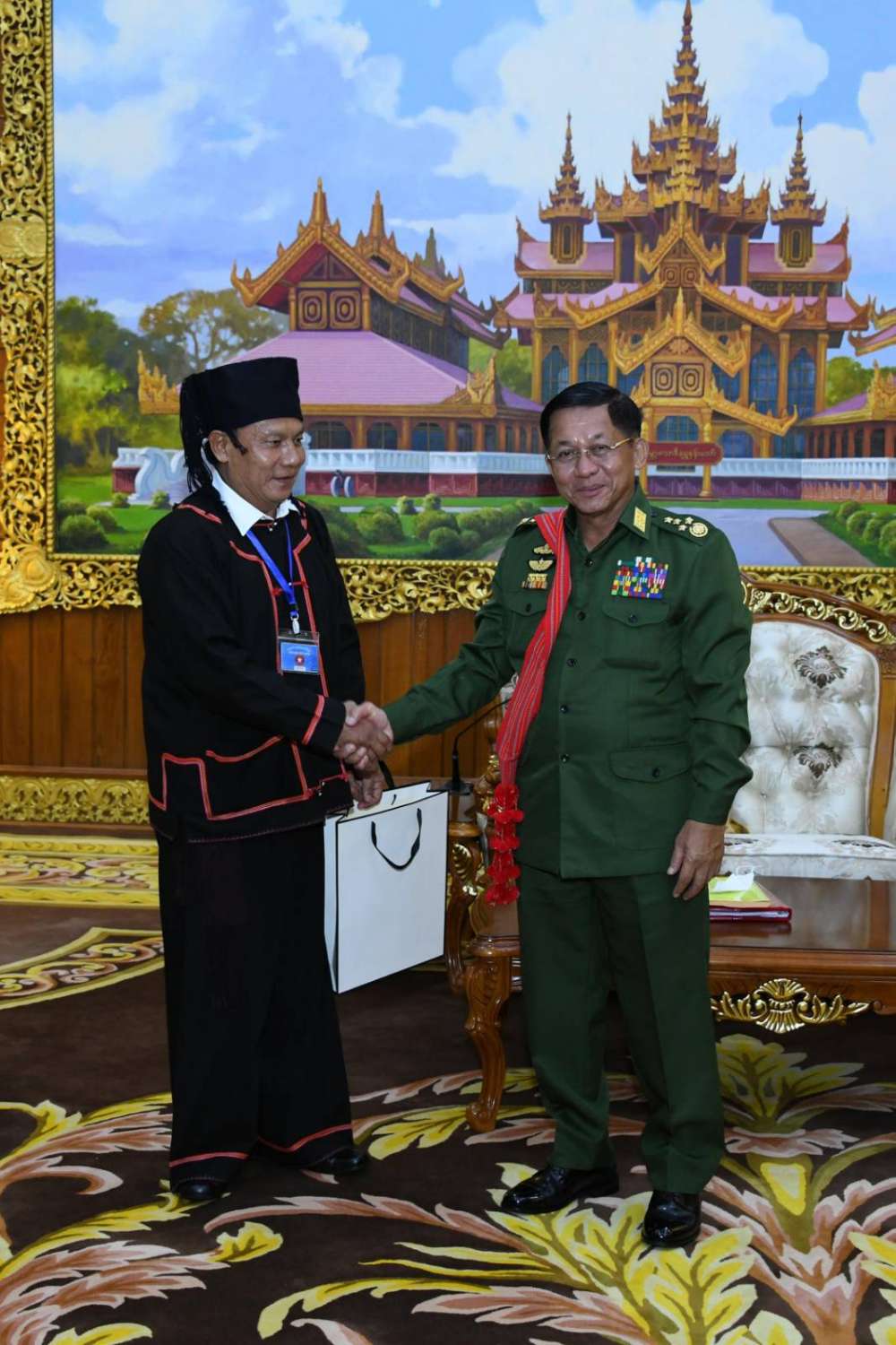 တွေ့ဆုံပွဲအပြီးတွင် နိုင်ငံတော်စီမံအုပ်ချုပ်ရေးကောင်စီဥက္ကဋ္ဌ တပ်မတော်ကာကွယ်ရေးဦးစီးချုပ်က လားဟူဒီမိုကရက်တစ်အစည်းအရုံး(LDU)မှ အထွေထွေအတွင်းရေးမှူးနှင့် အဖွဲ့ဝင်များအား အမှတ်တရလက်ဆောင်ပစ္စည်းများ ပေးအပ်ရာ လားဟူဒီမိုကရက်တစ်အစည်းအရုံး (LDU)မှ အထွေထွေအတွင်းရေးမှူးက ဒေသထွက်လက်ဆောင်ပစ္စည်းများကို ပြန်လည်ပေးအပ်ခဲ့ပြီး အမှတ်တရစုပေါင်းဓာတ်ပုံရိုက်ကြသည်။