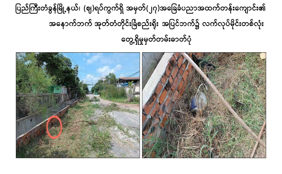 ထိုသို့လုပ်ဆောင်လျက်ရှိရာ ဇူလိုင်လ ၉ ရက် နံနက် ၉ နာရီခွဲအချိန်တွင် မန္တလေးတိုင်းဒေသကြီး၊ ပြည်ကြီးတံခွန်မြို့နယ်၊ (ဈ)ရပ်ကွက်ရှိ အမှတ်(၂၇) အခြေခံပညာ အထက်တန်းကျောင်း၏ အနောက်ဘက် အုတ်တံတိုင်းခြံစည်းရိုး အပြင်ဘက် ၆၀(C)လမ်းဘေးရှိ ရေမြောင်းအနီး၌ အကြမ်းဖက် သမားများ ထောင်ထားသည့် လက်လုပ်မိုင်းတစ်လုံးတွေ့ရှိကြောင်း သတင်းအရ လုံခြုံရေးတပ်ဖွဲ့ဝင်များက သွားရောက်စစ်ဆေးပြီး အဆိုပါလက်လုပ်မိုင်းအား သက်မဲ့ပြုလုပ် ရှင်းလင်းခဲ့ကြောင်းသိရသည်။
