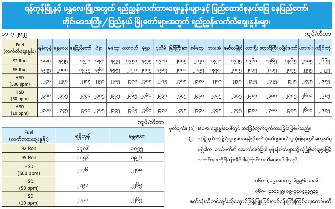 ရန်ကုန်မြို့နှင့် မန္တလေးမြို့အတွက် ရည်ညွှန်းလက်ကားဈေးနှုန်းများနှင့် ပြည်ထောင်စုနယ်မြေ နေပြည်တော်၊ တိုင်းဒေသကြီး/ ပြည်နယ် မြို့တော်များအတွက် ရည်ညွှန်းလက်လီဈေးနှုန်းများ