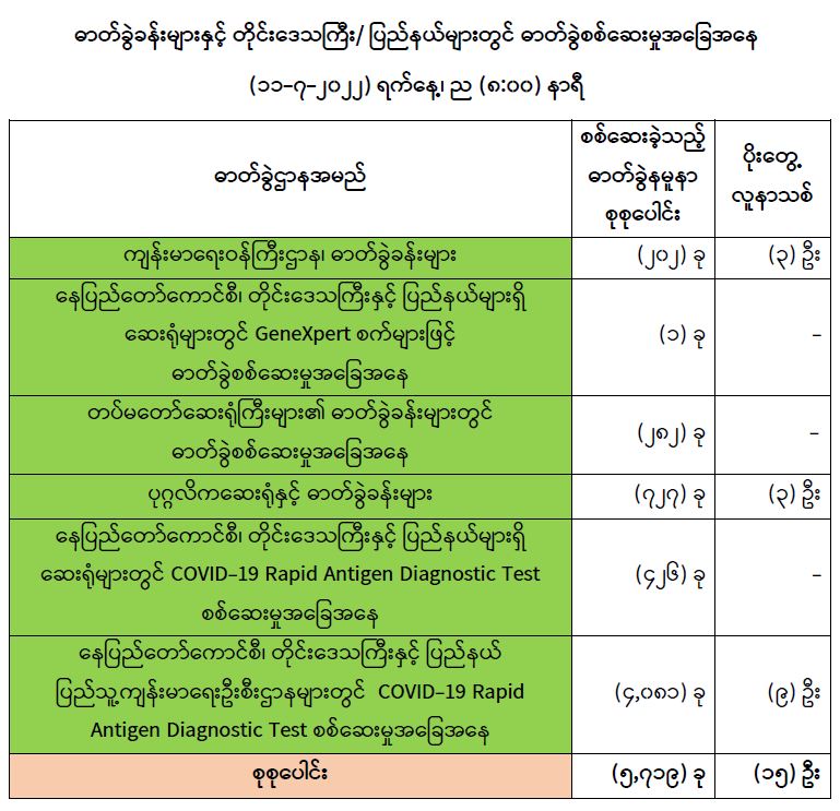 COVID-19 သံသယလူနာများ၊ ဓာတ်ခွဲအတည်ပြုလူနာနှင့် အနီးကပ်ထိတွေ့ခဲ့သူများနှင့် အသွားအလာ ကန့်သတ်ထားရှိသူများအား COVID-19 ရောဂါ ရှိ၊ မရှိ ဓာတ်ခွဲစစ်ဆေးခြင်း ပုံမှန်ဆောင်ရွက်လျက်ရှိပြီး (၁၀-၇-၂၀၂၂) ရက်နေ့၊ ည (၈:၀၀) နာရီမှ (၁၁-၇-၂၀၂၂) ရက်နေ့၊ ည (၈:၀၀) နာရီအတွင်း ဓာတ်ခွဲနမူနာစုစုပေါင်း (၅,၇၁၉) ခုအား စစ်ဆေးပြီးစီးခဲ့ရာ COVID-19 ရောဂါ ဓာတ်ခွဲ အတည်ပြုလူနာသစ် (၁၅) ဦး တွေ့ရှိရပါသည်။ ထို့ကြောင့် ယနေ့အတွက် ရောဂါပိုးတွေ့ရှိမှု ရာခိုင်နှုန်းမှာ (၀.၂၆) ရာခိုင်နှုန်း ရှိပါသည်။