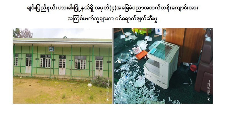 ထိုသို့ ဆောင်ရွက်လျက်ရှိရာ ဇူလိုင် ၁၀ ရက် မွန်းလွဲ ၁၂ နာရီ ၃၀ မိနစ်ခန့်တွင် ချင်းပြည်နယ်၊ ဟားခါးမြို့နယ်၊ ဈေးသစ်ရပ်ကွက်ရှိ အမှတ်(၄) အခြေခံပညာ အထက်တန်းကျောင်းအား အကြမ်းဖက်သမားများက ကျောင်းဝင်းအတွင်းဝင်ရောက်၍ ကျောင်းဆောင်များနှင့် ကျောင်းဆောင်အတွင်းရှိ ပစ္စည်းများအား ဖျက်ဆီးခဲ့သဖြင့် ကျောင်းဆောင် ၅ ဆောင်ရှိ ပြတင်းပေါက်မှန် ၁၈၅ ချပ်၊ တံခါးမကြီး ၁ ခု၊ မေးခွန်းတိုက် ၁ လုံး၊ ကျောင်းအုပ်ကြီးရုံးခန်းရှိ မိတ္တူကူးစက် ၁ လုံး၊ CCTV ကင်မရာ ၂ လုံး၊ ဆိုဖာထိုင်ခုံ၊ စားပွဲ ၂ လုံး၊ စုစုပေါင်းတန်ဖိုးငွေ ၁,၆၀၇,၅၀၀ ကျပ်ခန့် ပျက်စီးဆုံးရှုံးခဲ့ကြောင်း သိရသည်။