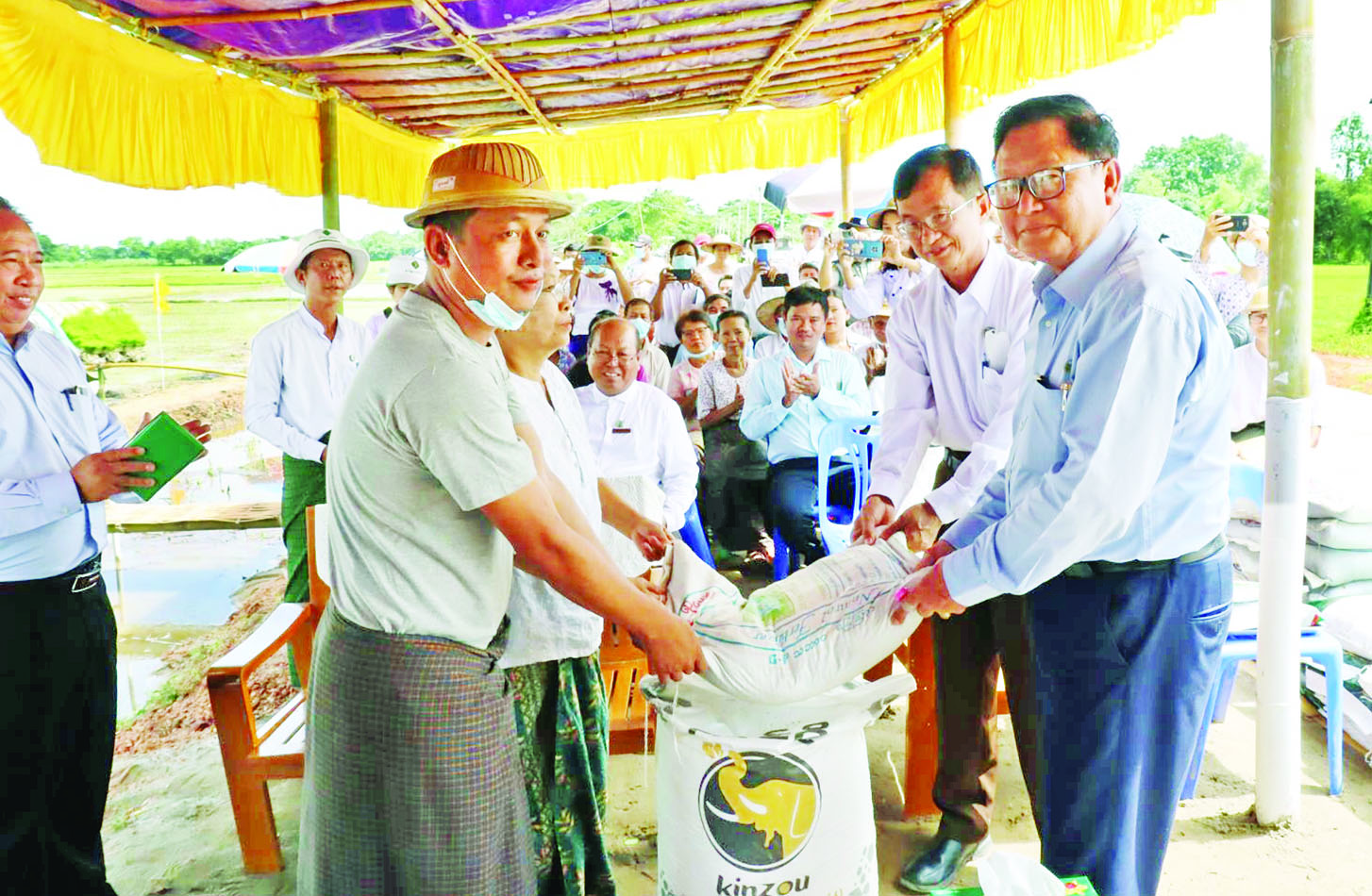 ထို့နောက် တက်ရောက်လာသည့် တောင်သူများကို သွင်းအားစုအနေဖြင့် ဓာတ်မြေသြဇာနှင့် ဆေးဝါးများ ပံ့ပိုးပေးအပ်ပြီး တောင်သူများနှင့်အတူ ကောက်စိုက်စက်ဖြင့် ကောက်စိုက်သရုပ်ပြမှုကို ကြည့်ရှုအားပေးသည်။