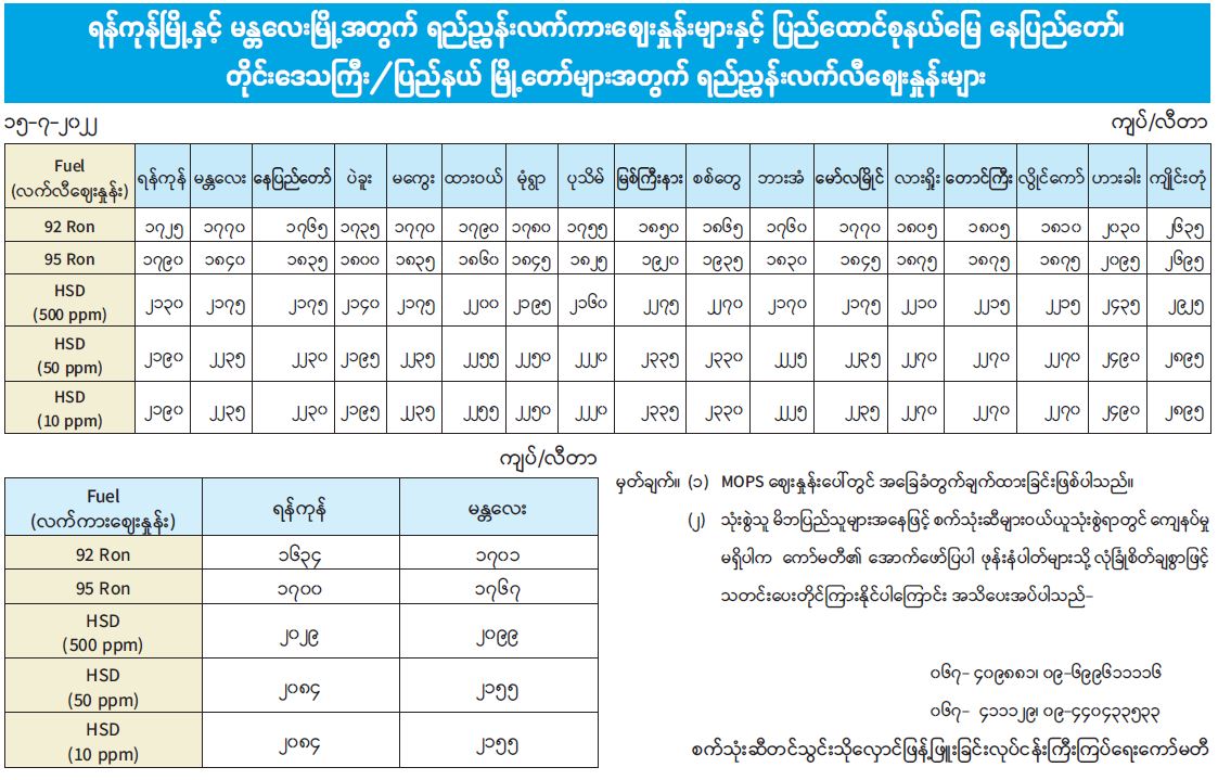 ရန်ကုန်မြို့နှင့်မန္တလေးမြို့အတွက် ရည်ညွှန်းလက်ကားဈေးနှုန်းများနှင့် ပြည်ထောင်စုနယ်မြေ၊ နေပြည်တော်၊ တိုင်းဒေသကြီး/ပြည်နယ် မြို့တော်များအတွက် ရည်ညွှန်းလက်လီဈေးနှုန်းများ