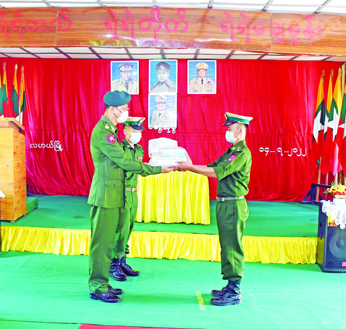 စစ်ကိုင်းတိုင်းဒေသကြီး နာဂ ကိုယ်ပိုင်အုပ်ချုပ်ခွင့်ရဒေသ လဟယ်မြို့သို့ ရောက်ရှိနေသော နိုင်ငံတော်စီမံအုပ်ချုပ်ရေး ကောင်စီအဖွဲ့ဝင် ကာကွယ်ရေးဝန်ကြီးဌာန ပြည်ထောင်စုဝန်ကြီး ဗိုလ်ချုပ်ကြီး မြထွန်းဦး၊ တိုင်း ဒေသကြီးဝန်ကြီးချုပ် ဦးမြတ်ကျော်၊ အနောက်မြောက်တိုင်း စစ်ဌာနချုပ် တိုင်းမှူး ဗိုလ်မှူးချုပ် သန်းထိုက်နှင့် တာဝန်ရှိသူများသည် ဇူလိုင် ၁၄ ရက် နံနက်ပိုင်းတွင် လဟယ်မြို့ရှိ နယ်မြေခံတပ်ရင်းခန်းမ၌ အရာရှိ၊ စစ်သည်၊ မိသားစုဝင်များအား တွေ့ဆုံအမှာစကားပြောကြားပြီး တပ်နယ်မိသားစုများအတွက် စားသောက်ဖွယ်ရာများနှင့် ကိုဗစ်-၁၉ ရောဂါကာကွယ်ရေး အထောက်အကူပြုပစ္စည်းများ ပေးအပ်သည်။