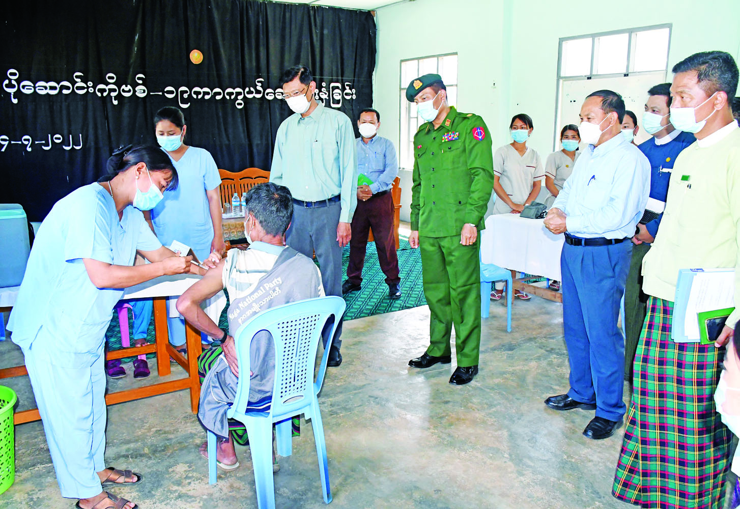 ယင်းနောက် ပြည်ထောင်စုဝန်ကြီးနှင့် တာဝန်ရှိသူများသည် လဟယ်မြို့ ပြည်သူ့ဆေးရုံသို့ ရောက်ရှိပြီး ဒေသခံတိုင်းရင်းသားများအား ကိုဗစ် - ၁၉ ရောဂါကာကွယ်ဆေး Booster Dose ထိုးနှံပေးနေမှုများကို ကြည့်ရှုအားပေးကြသည်။