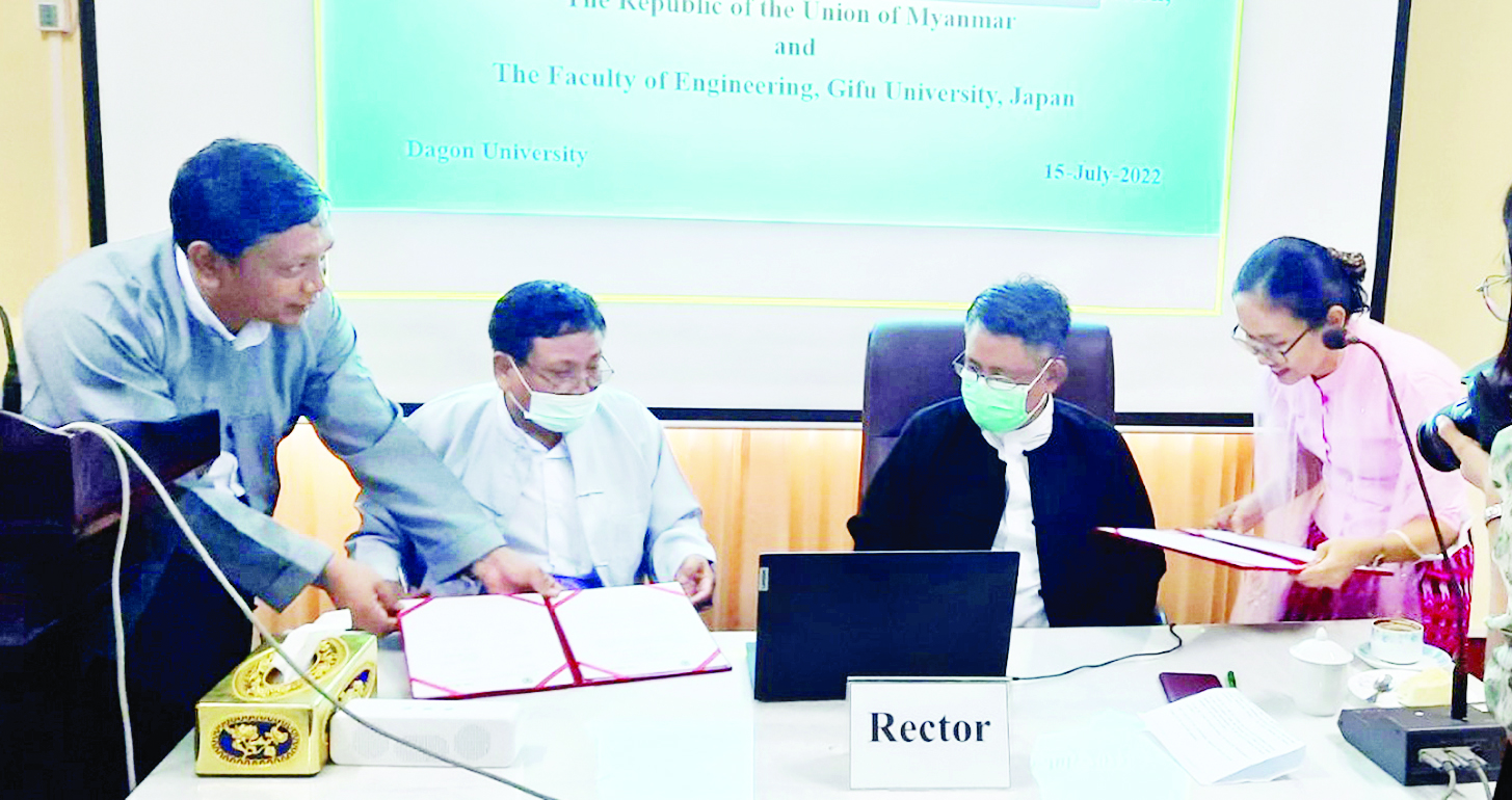 ဒဂုံတက္ကသိုလ် သိပ္ပံဌာနများနှင့် ဂျပန်နိုင်ငံ Gifu University အင်ဂျင်နီယာ မဟာဌာနကြီးအောက်ရှိ သိပ္ပံဌာနများအကြား MoU ရေးထိုးပွဲအခမ်းအနားကို ယနေ့ မွန်းလွဲ ၁ နာရီခွဲတွင် ဒဂုံတက္ကသိုလ် ပါမောက္ခချုပ်ရုံးခန်း အစည်းအဝေးခန်းမ၌ ကျင်းပသည်။
