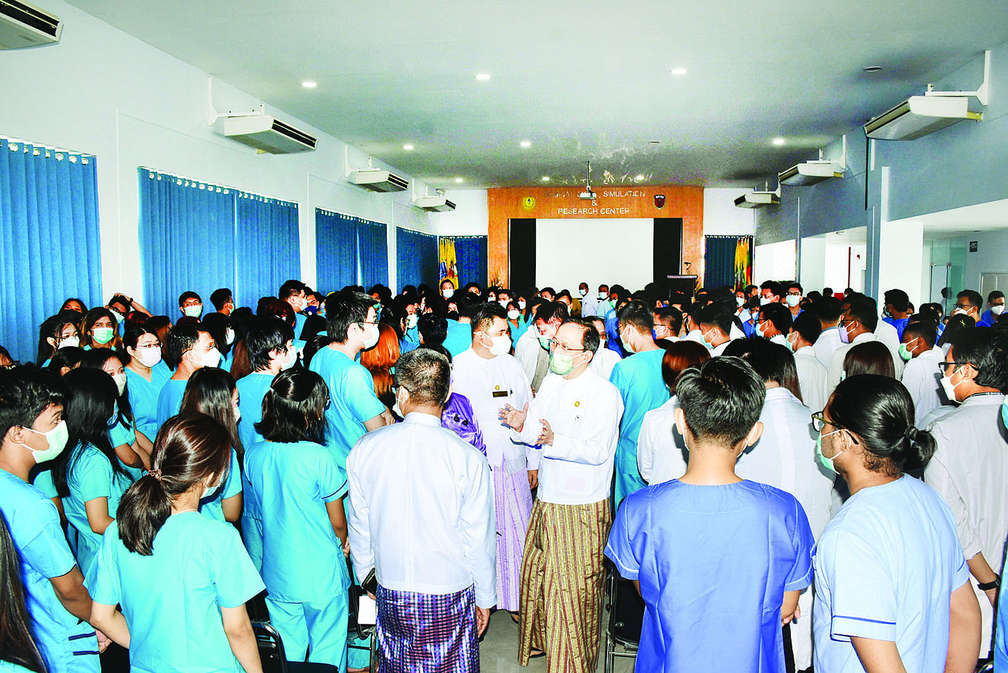 ဦးစွာ ပြည်ထောင်စုဝန်ကြီး ဒေါက်တာသက်ခိုင်ဝင်းက ကျန်းမာရေးဝန်ကြီးဌာန၏ ရည်မှန်းချက်များ အောင်မြင်မှုရရှိစေရန်အတွက် အရည်အသွေးပြည့်ဝသော လူ့စွမ်းအားအရင်းအမြစ်များ အလုံအလောက်မွေးထုတ်ပြီး စဉ်ဆက်မပြတ် လေ့ကျင့်ပေးနိုင်ရန် ကျန်းမာရေးလူ့စွမ်းအား အရင်းအမြစ်ဦးစီးဌာနနှင့် ဆေးတက္ကသိုလ်များနှင့် ဆေးပညာ နှီးနွှယ်တက္ကသိုလ်များ၏ အခန်းကဏ္ဍသည် လွန်စွာအရေးကြီးပါကြောင်း၊ ကျန်းမာရေးလူ့စွမ်းအားစုများတွင် ပါဝင်သည့် ဆရာဝန်များ၊ သွားဘက်ဆိုင်ရာ ဆရာဝန်များ၊ ဆေးဝါးပညာရှင်များ၊ ဆေးဘက်ဆိုင်ရာ နည်းပညာရှင် များ၊ သူနာပြုများ၊ အခြေခံ ကျန်းမာရေး ပညာရှင်များကို လေ့ကျင့်မွေးထုတ်ပေးခဲ့ရာ ယနေ့အထိ ဆရာဝန် ၄၇၃၁၃ ဦး၊ သွားဘက်ဆိုင်ရာ ဆရာဝန် ၅၄၂၇ ဦး၊ ဆေးဝါးပညာရှင် ၄၂၀၃ ဦး၊ ဆေးဘက်ဆိုင်ရာ နည်းပညာရှင် ၄၅၀၁ ဦး၊ သူနာပြုသိပ္ပံဘွဲ့ရ ၉၄၅၄ ဦး၊ အခြေခံကျန်းမာရေး ပညာရှင် ၂၃၅၆ ဦးတို့ကို မွေးထုတ် ပေးပြီးဖြစ်ပါကြောင်း၊ လက်ရှိအချိန်တွင် ဒီပလိုမာ၊ မဟာသိပ္ပံ နှင့် ပါရဂူ/ဆေးလက်တွေ့ပါရဂူ ဘွဲ့လွန်သင်တန်း အမျိုးအစား ၁၄၀ ကို ဖွင့်လှစ်ပို့ချပေးလျက် ရှိရာ ၂၀၂၁ ခုနှစ် ဒီဇင်ဘာ ၃၁ ရက် အထိ ဒီပလိုမာဘွဲ့ရရှိသူပေါင်း ၃၇၂၇ ဦး၊ ဆေးပညာမဟာသိပ္ပံဘွဲ့ ရရှိသူပေါင်း ၁၀၉၃၆ ဦး၊ ပါရဂူဘွဲ့ ရရှိသူပေါင်း ၁၅၀၆ ဦးကို မွေးထုတ်ပေးနိုင်ခဲ့ပြီးဖြစ်ကြောင်း။