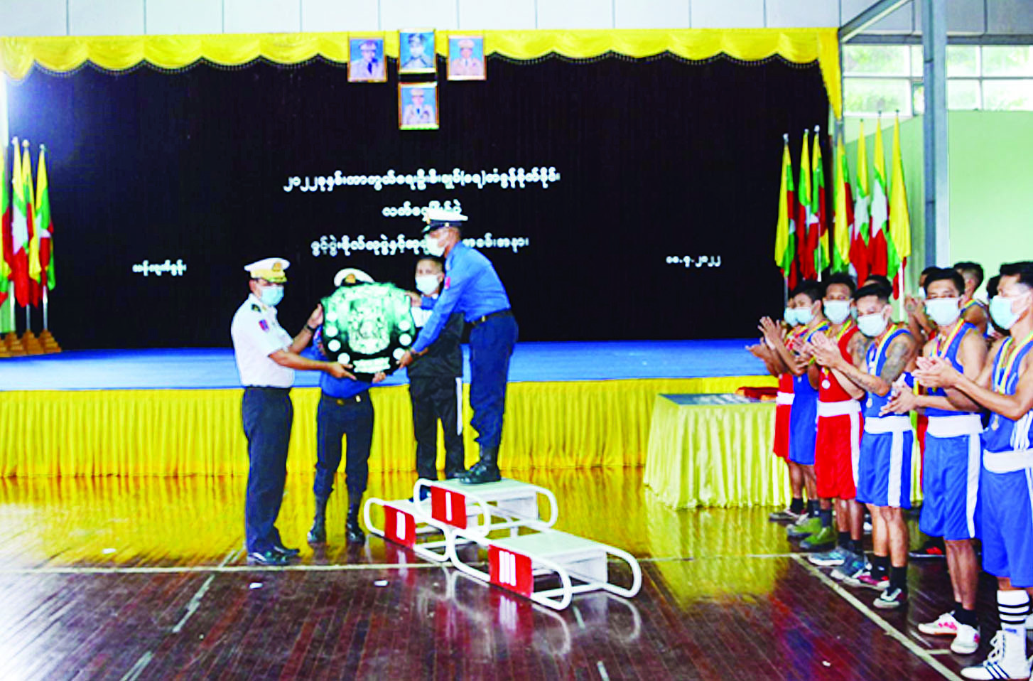 ၂၀၂၂ ခုနှစ် ကာကွယ်ရေးဦးစီးချုပ် (ရေ) တံခွန်စိုက်ဒိုင်း လက်ဝှေ့ပြိုင်ပွဲ ဗိုလ်လုပွဲနှင့်ဆုပေးပွဲကို ယနေ့ညနေပိုင်းတွင် ဧရာဝတီရေတပ်စခန်းဌာနချုပ်ရှိ သီဟသူရထွန်းတင်ခန်းမ၌ ပြုလုပ်ရာ နယ်မြေခံရေတပ် ကွပ်ကဲမှုဌာနချုပ်၊ ဌာနချုပ်မှူး ဗိုလ်ချုပ် ထိန်ဝင်းနှင့် အရာရှိ၊ စစ်သည်၊ မိသားစုများ၊ ပြိုင်ပွဲဝင်အားကစားသမားများနှင့် အားကစားဝါသနာရှင်များ တက်ရောက်ကြသည်။