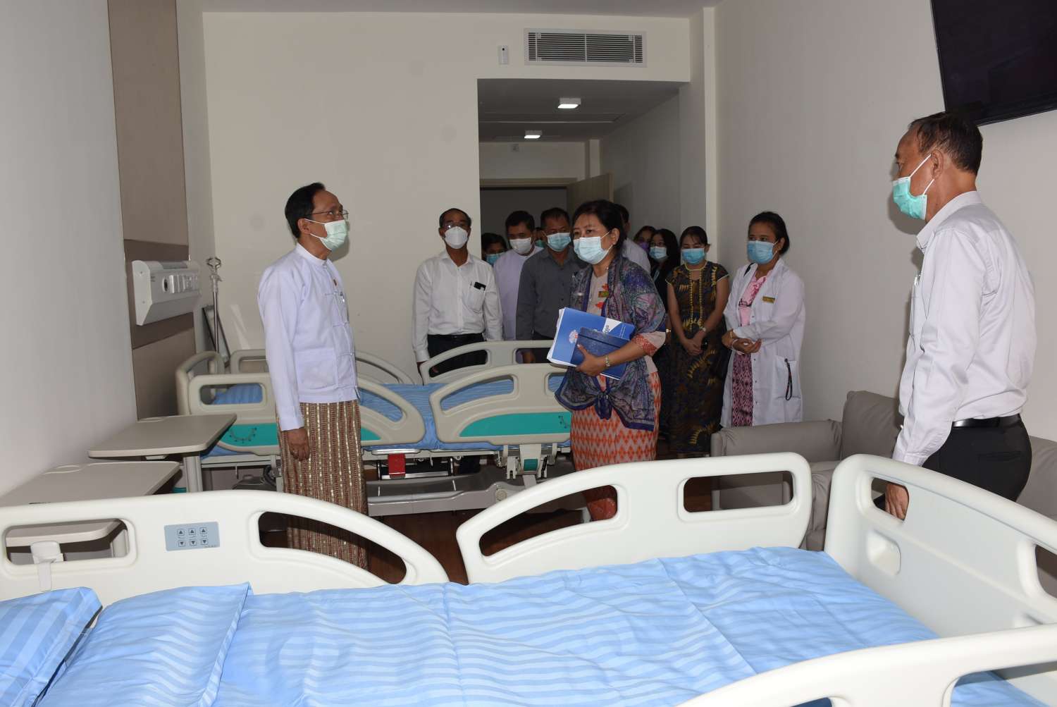 ပြည်ထောင်စုဝန်ကြီးနှင့်အဖွဲ့သည် အဆိုပါသုံးထပ်လူနာဆောင်သစ်ရှိ အစည်းအဝေးခန်းမ၌ တာဝန်ရှိသူများနှင့် တွေ့ဆုံခဲ့ရာတွင် Asia World ကုမ္ပဏီမှ အဆောက်အဦဆောက်လုပ်မှုအပိုင်း၊ လူနာခန်းများပြင်ဆင်ထားရှိမှုအခြေအနေ၊ အဆောက်အဦ၏ ရေ၊ မီး၊ လျှပ်စစ်နှင့် မီးသတ်စနစ် ဆောင်ရွက်ထားရှိမှုအခြေအနေများနှင့် ပတ်သက်၍ ရှင်းလင်းတင်ပြခဲ့ပါသည်။ ပြည်ထောင်စုဝန်ကြီးက တင်ပြချက်များအပေါ် လိုအပ်သည်များမှာကြားဖြည့်ဆည်းပေး၍ ယခုသုံးထပ်လူနာဆောင်သစ်တွင် လူ့နာများထားရှိနိုင်ရေးအတွက် အဆောက်အဦပြင်ဆင်ထားရှိမှုအပိုင်း ပြည့်စုံစွာဆောင်ရွက်ထားပြီး Solar ဖြင့် မီးပေးစနစ်၊ Wifi စနစ် စသည်ဖြင့် ပြည့်စုံစွာဆောင်ရွက်ထားသည်ကို တွေ့ရှိရပါကြောင်း၊ ဝေဘာဂီအထူးကုဆေးရုံကြီးကို National Center for Infectious Diseases အဖြစ် တည်ထောင်နိုင်ရေး မျှော်မှန်းထားရှိရာ ရေရှည်တွင် ကူးစက်မြန်ရောဂါလူနာများ အဓိကတက်ရောက်နိုင်သည့် နိုင်ငံတကာအဆင့်မီဆေးရုံအဖြစ် စံနမူနာပြဆောင်ရွက်မည်ဖြစ်ပါကြောင်း၊ လိုအပ်သည့် ဆေးရုံသုံးပစ္စည်းများနှင့် ဝန်ထမ်းများကို တစ်ဆင့်ချင်း ဖြည့်ဆည်းဆောင်ရွက်မည်ဖြစ်ပါကြောင်း၊ ဝန်ထမ်းများနေထိုင်ရေး အဆင်ပြေစေရန် စီစဉ်ဆောင်ရွက်ပေးမည်ဖြစ်ပါကြောင်း၊ အမြန်ဆုံးဖွင့်လှစ်နိုင်ရေးအတွက် ကြိုးပမ်း ဆောင်ရွက်သွားကြရန်နှင့် ရေရှည်ကောင်းမွန်အောင် အဆောက်အဦပြင်ဆင်ထိန်းသိမ်းခြင်းကို ပုံမှန်ဆောင်ရွက်ရန် လမ်းညွှန်မှာကြားသည်။