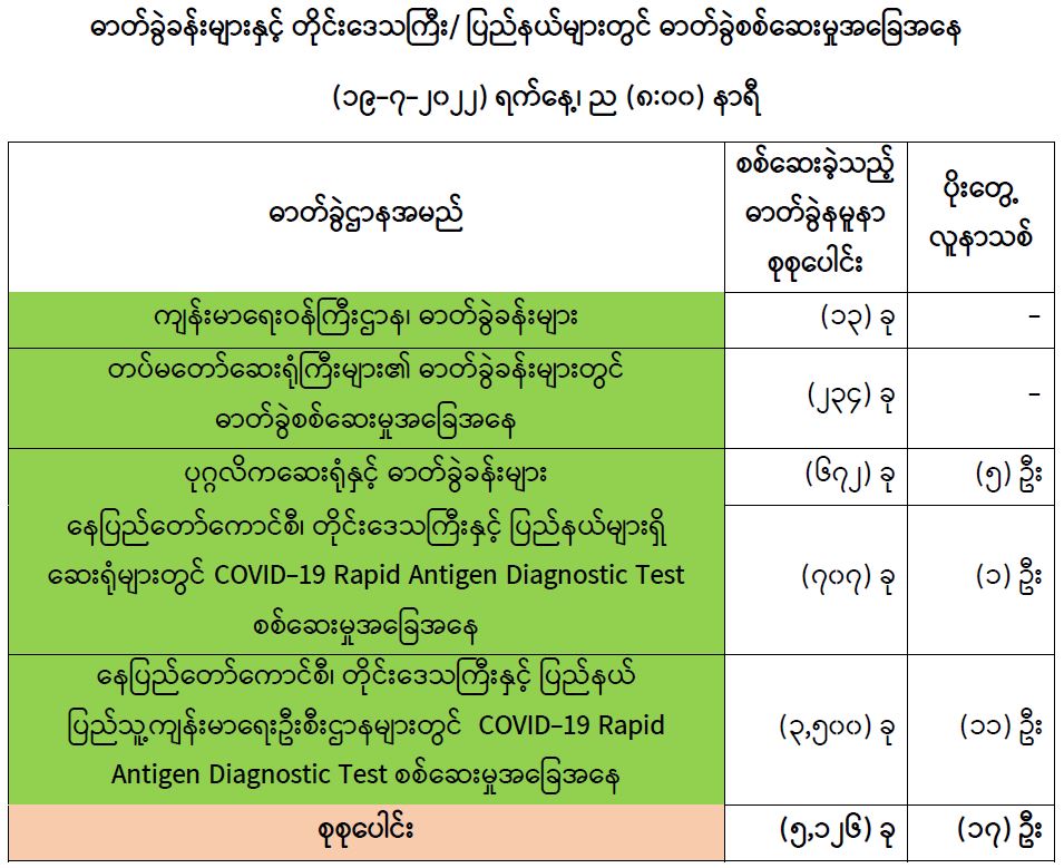 COVID-19 သံသယလူနာများ၊ ဓာတ်ခွဲအတည်ပြုလူနာနှင့် အနီးကပ်ထိတွေ့ခဲ့သူများနှင့် အသွားအလာကန့်သတ်ထားရှိသူများအား COVID-19 ရောဂါ ရှိ၊ မရှိ ဓာတ်ခွဲစစ်ဆေးခြင်း ပုံမှန် ဆောင်ရွက်လျက်ရှိပြီး (၁၈-၇-၂၀၂၂) ရက်နေ့၊ ည (၈:၀၀) နာရီမှ (၁၉-၇-၂၀၂၂) ရက်နေ့၊ ည (၈:၀၀) နာရီအတွင်း ဓာတ်ခွဲနမူနာစုစုပေါင်း (၅,၁၂၆) ခုအား စစ်ဆေးပြီးစီးခဲ့ရာ COVID-19 ရောဂါ ဓာတ်ခွဲအတည်ပြုလူနာသစ် (၁၇) ဦး တွေ့ရှိရပါသည်။ ထို့ကြောင့် ယနေ့အတွက် ရောဂါပိုးတွေ့ရှိမှု ရာခိုင်နှုန်းမှာ (၀.၃၃) ရာခိုင်နှုန်း ရှိပါသည်။