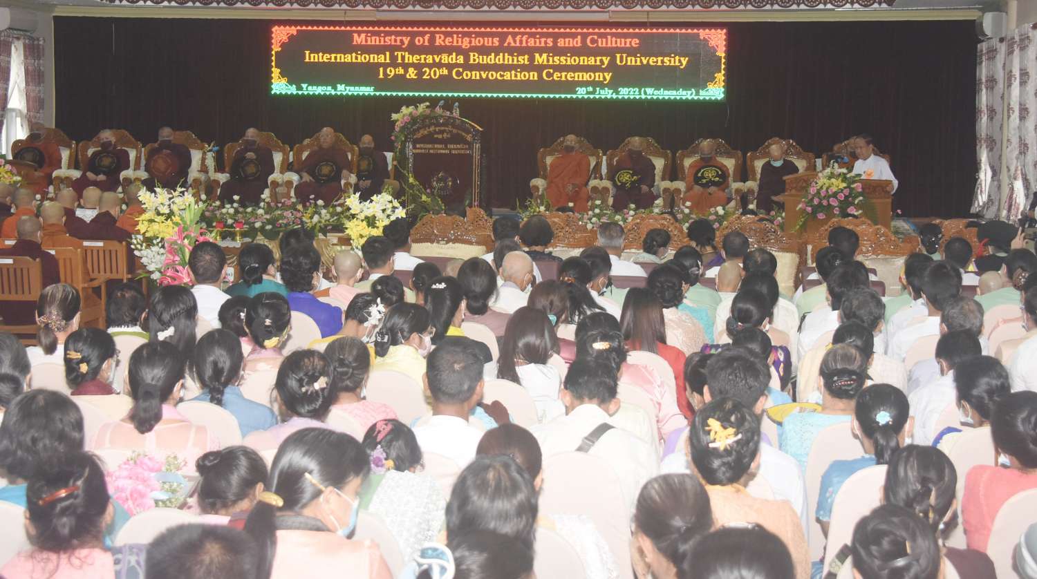 သာသနာရေးနှင့်ယဉ်ကျေးမှုဝန်ကြီးဌာန၊ အပြည်ပြည်ဆိုင်ရာ ထေရဝါဒဗုဒ္ဓသာသနာပြုတက္ကသိုလ်၊ (၂၀၁၉-၂၀၂၀) (၂၀၂၁-၂၀၂၂) ပညာသင်နှစ်များတွင် တက္ကသိုလ် (ဗုဒ္ဓဓမ္မ)သင်တန်း အသီးသီးသို့ တက်ရောက်အောင်မြင်ခဲ့ကြသော ပြည်တွင်း၊ပြည်ပ သင်တန်းသားများ ဘွဲ့လက်မှတ်နှင့် အဆောင်အယောင်များ ချီးမြှင့်အပ်နှင်းပွဲအခမ်းအနားကို ယနေ့မွန်းလွဲ ၁ နာရီတွင် ရန်ကုန်တိုင်းဒေသကြီး၊ မရမ်းကုန်းမြို့နယ်၊ အပြည်ပြည်ဆိုင်ရာ ထေရဝါဒဗုဒ္ဓသာသနာပြုတက္ကသိုလ်၊ Seminar Hall ၌ ကျန်းမာရေးဝန်ကြီးဌာနက ချမှတ်ထားသော ကိုဗစ်-၁၉ ကာကွယ်ရေး စည်းကမ်းများနှင့်အညီ ကျင်းပသည်။